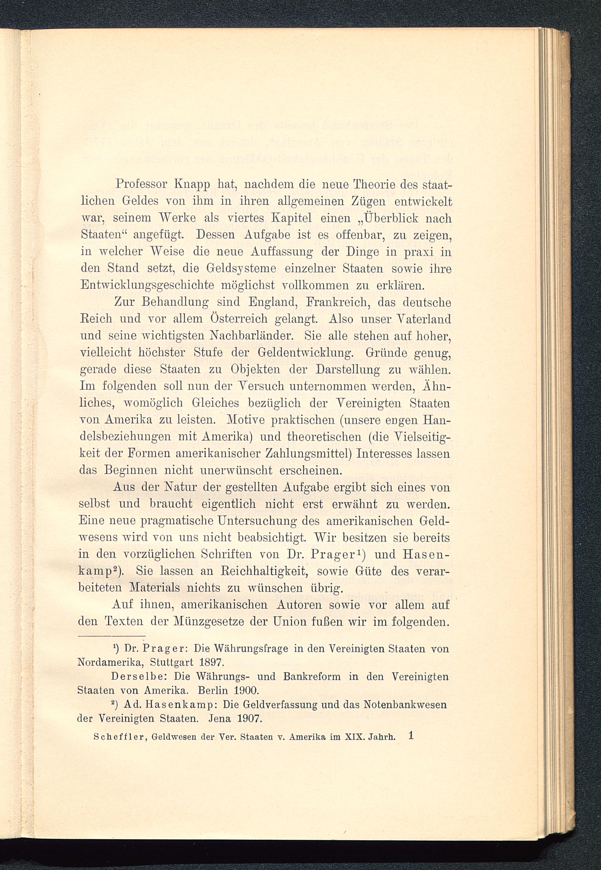 Aus der Natur der gestellten Aufgabe ergibt sich eines vonselbst und braucht eigentlich nicht erst erwähnt zu werden.Eine neue pragmatische Untersuchung des amerikanischen Geld-wesens wird von uns nicht beabsichtigt. Wir besitzen sie bereitsin den vorzüglichen Schriften von Dr. Prager 1 ) und Hasen-kamp 2 ). Sie lassen an Reichhaltigkeit, sowie Güte des verar-beiteten Materials nichts zu wünschen übrig.