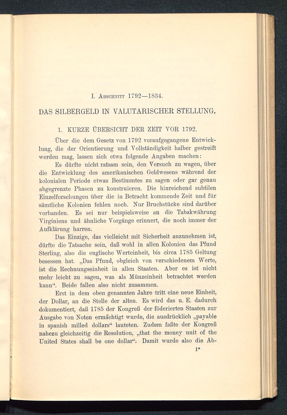 Erst in dem oben genannten Jahre tritt eine neue Einheit,der Dollar, an die Stelle der alten. Es wird das u. E. dadurchdokumentiert, daß 1785 der Kongreß der föderierten Staaten zurAusgabe von Noten ermächtigt wurde, die ausdrücklich „payablein spanish milled dollars“ lauteten. Zudem faßte der Kongreßnahezu gleichzeitig die Resolution, „that the money unit of theUnited States shall be one dollar“. Damit wurde also die Ab-