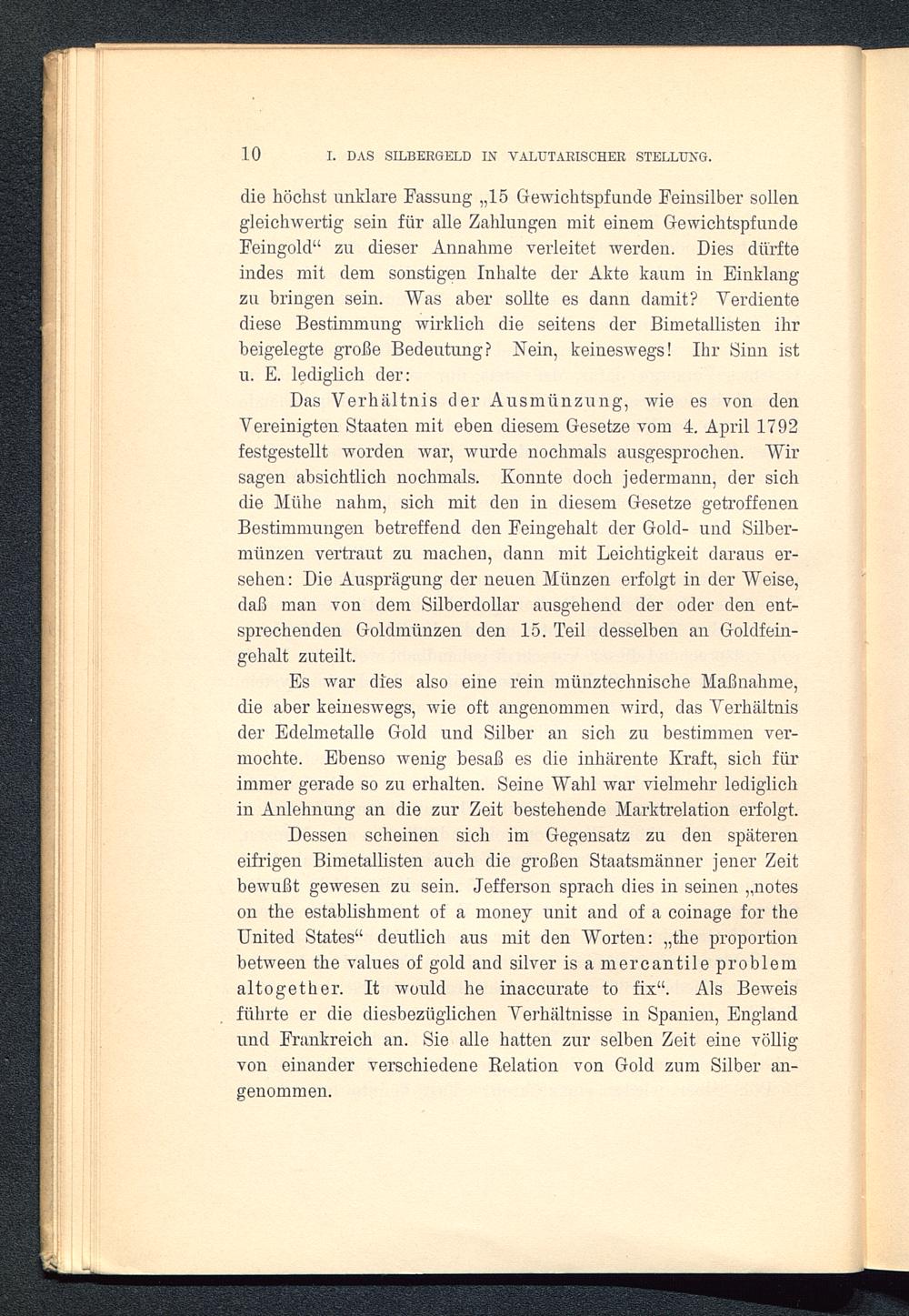 Dessen scheinen sich im Gegensatz zu den spätereneifrigen Bimetallisten auch die großen Staatsmänner jener Zeitbewußt gewesen zu sein. Jefferson sprach dies in seinen „noteson the establishment of a money unit and of a coinage for theUnited States “ deutlich aus mit den Worten: „the proportionbetween the values of gold and silver is a mercantile problemaltogether. It would he inaccurate to fix“. Als Beweisführte er die diesbezüglichen Verhältnisse in Spanien, England und Frankreich an. Sie alle hatten zur selben Zeit eine völligvon einander verschiedene Relation von Gold zum Silber an-