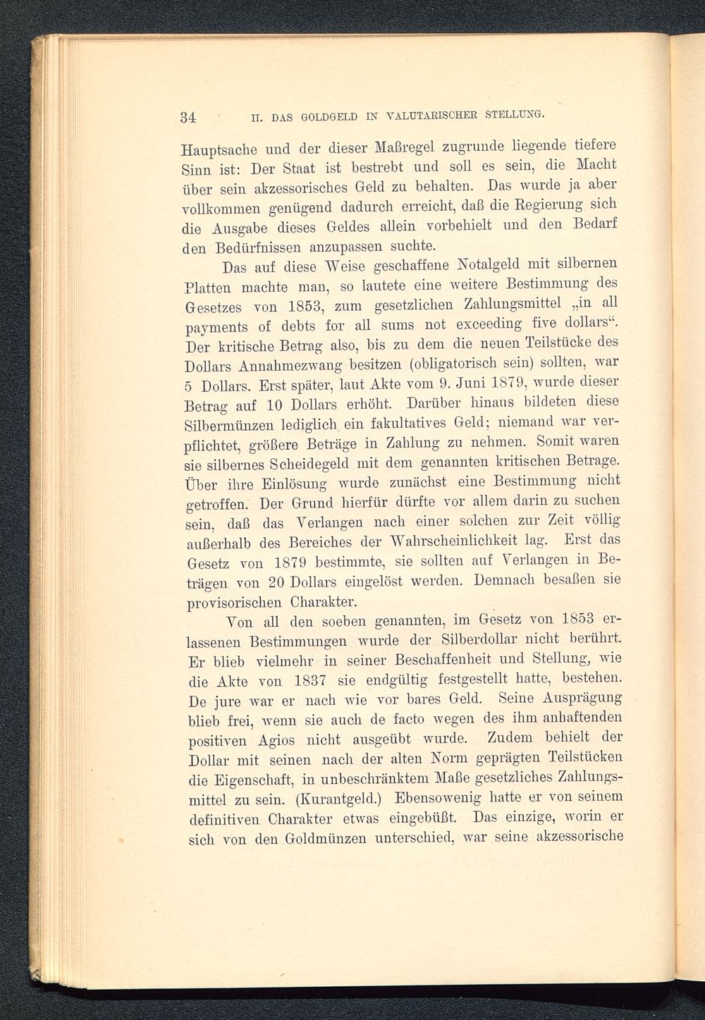 Von all den soeben genannten, im Gesetz von 1853 er-lassenen Bestimmungen wurde der Silberdollar nicht berührt.Er blieb vielmehr in seiner Beschaffenheit und Stellung, wiedie Akte von 1837 sie endgültig festgestellt hatte, bestehen.De jure war er nach wie vor bares Geld. Seine Ausprägungblieb frei, wenn sie auch de facto wegen des ihm anhaftendenpositiven Agios nicht ausgeübt wurde. Zudem behielt derDollar mit seinen nach der alten Norm geprägten Teilstückendie Eigenschaft, in unbeschränktem Maße gesetzliches Zahlungs-mittel zu sein. (Kurantgeld.) Ebensowenig hatte er von seinemdefinitiven Charakter etwas eingebüßt. Das einzige, worin ersich von den Goldmünzen unterschied, war seine akzessorische