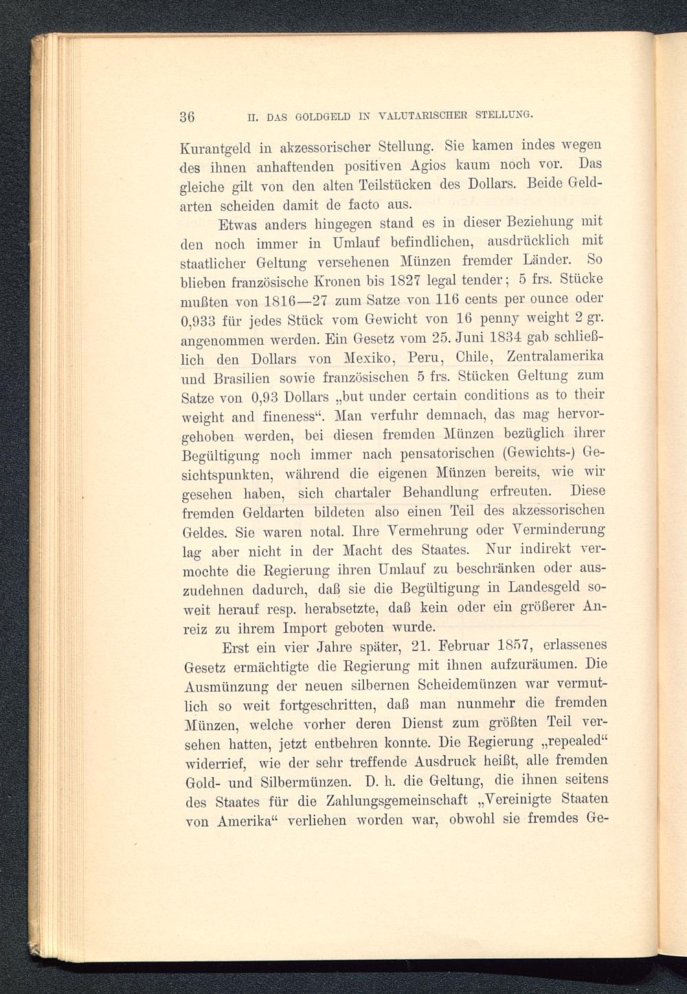 Etwas anders hingegen stand es in dieser Beziehung mitden noch immer in Umlauf befindlichen, ausdrücklich mitstaatlicher Geltung versehenen Münzen fremder Länder. Soblieben französische Kronen bis 1827 legal tender; 5 frs. Stückemußten von 1816—27 zum Satze von 116 cents per ounce oder0,933 für jedes Stück vom Gewicht von 16 penny weight 2 gr.angenommen werden. Ein Gesetz vom 25. Juni 1834 gab schließ-lich den Dollars von Mexiko, Peru, Chile, Zentralamerika und Brasilien sowie französischen 5 frs. Stücken Geltung zumSatze von 0,93 Dollars „but under certain conditious as to theirweight and fineness“. Man verfuhr demnach, das mag hervor-gehoben werden, bei diesen fremden Münzen bezüglich ihrerBegültigung noch immer nach pensatorischen (Gewichts-) Ge-sichtspunkten, während die eigenen Münzen bereits, wie wirgesehen haben, sich chartaler Behandlung erfreuten. Diesefremden Geldarten bildeten also einen Teil des akzessorischenGeldes. Sie waren notal. Ihre Vermehrung oder Verminderunglag aber nicht in der Macht des Staates. Nur indirekt ver-mochte die Regierung ihren Umlauf zu beschränken oder aus-zudehnen dadurch, daß sie die Begültigung in Landesgeld so-weit herauf resp. herabsetzte, daß kein oder ein größerer An-reiz zu ihrem Import geboten wurde.