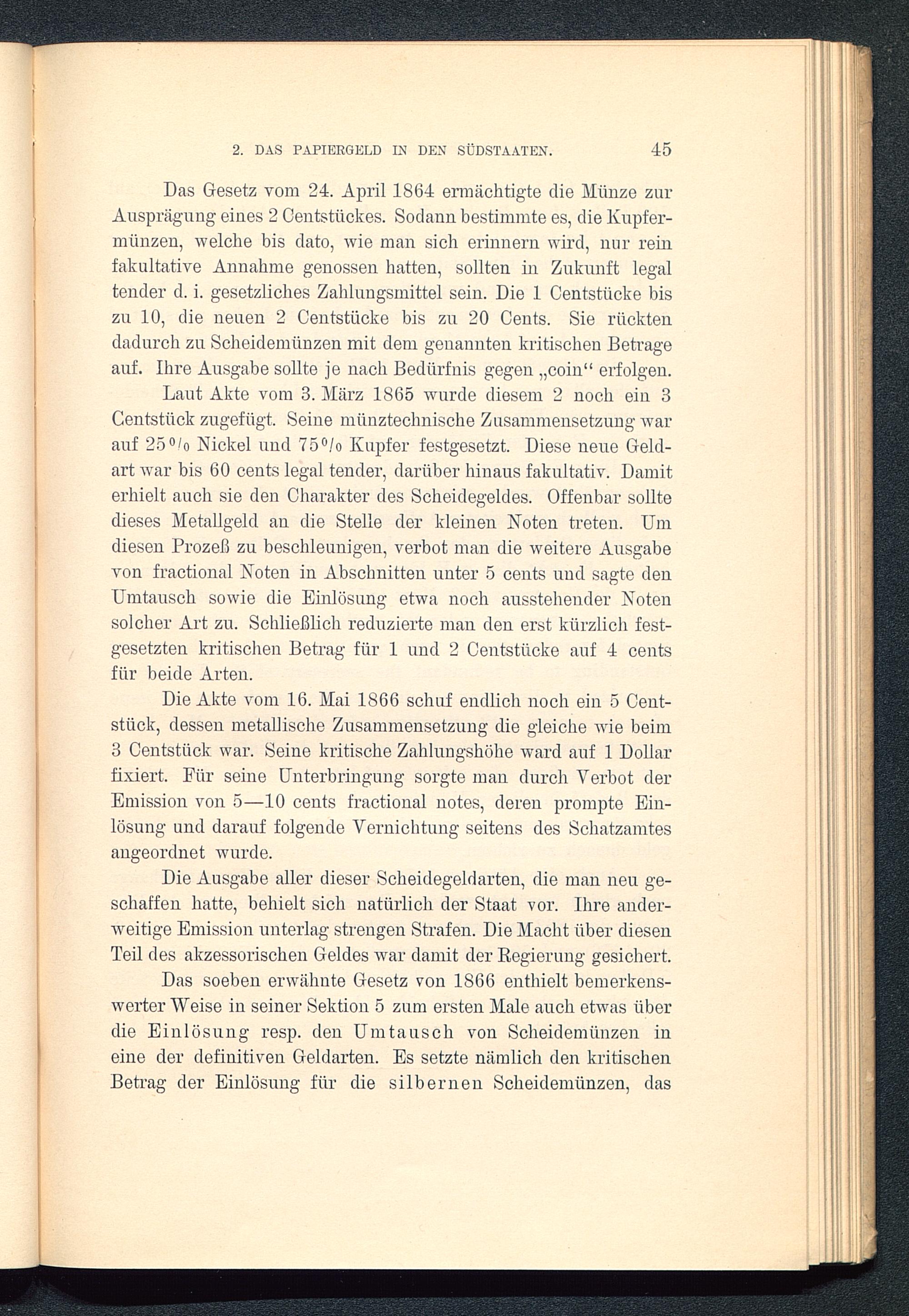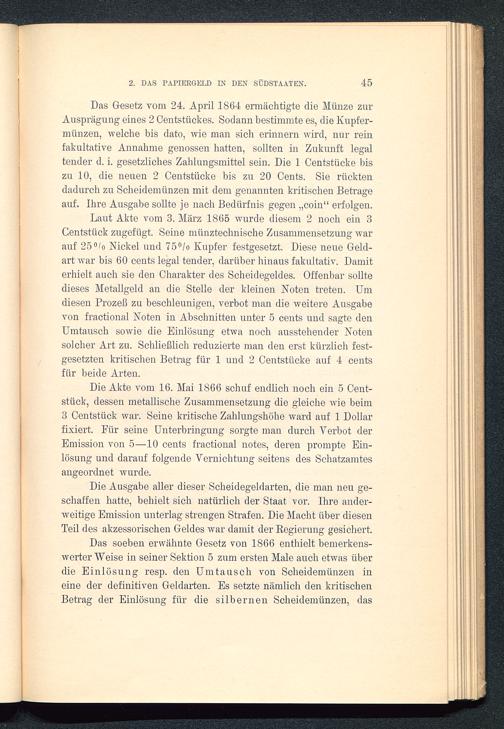 Das Gesetz vom 24. April 1864 ermächtigte die Münze zurAusprägung eines 2 Centstückes. Sodann bestimmte es, die Kupfer-münzen, welche bis dato, wie man sich erinnern wird, nur reinfakultative Annahme genossen hatten, sollten in Zukunft legaltender d. i. gesetzliches Zahlungsmittel sein. Die 1 Centstücke biszu 10, die neuen 2 Centstücke bis zu 20 Cents. Sie rücktendadurch zu Scheidemünzen mit dem genannten kritischen Betrageauf. Ihre Ausgabe sollte je nach Bedürfnis gegen „coin “ erfolgen.
