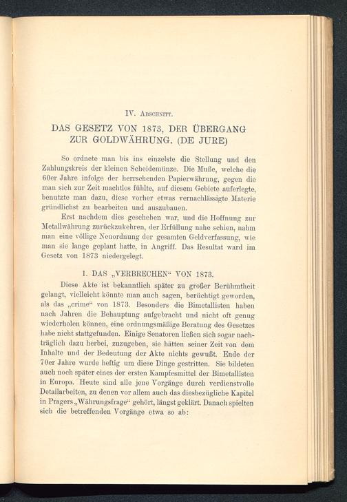Diese Akte ist bekanntlich später zu großer Berühmtheitgelangt, vielleicht könnte man auch sagen, berüchtigt geworden,als das „crime“ von 1873. Besonders die Bimetallisten habennach Jahren die Behauptung aufgebracht und nicht oft genugwiederholen können, eine ordnungsmäßige Beratung des Gesetzeshabe nicht stattgefunden. Einige Senatoren ließen sich sogar nach-träglich dazu herbei, zuzugeben, sie hätten seiner Zeit von demInhalte und der Bedeutung der Akte nichts gewußt. Ende der70er Jahre wurde heftig um diese Dinge gestritten. Sie bildetenauch noch später eines der ersten Kampfesmittel der Bimetallistenin Europa . Heute sind alle jene Vorgänge durch verdienstvolleDetailarbeiten, zu denen vor allem auch das diesbezügliche Kapitelin Pragers „Währungsfrage“ gehört, längst geklärt. Danach spieltensich die betreffenden Vorgänge etwa so ab: