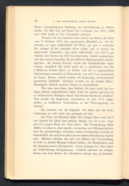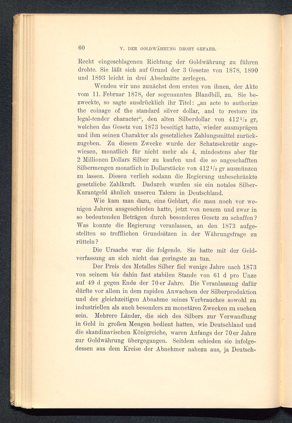 Wenden wir uns zunächst dem ersten von ihnen, der Aktevom 11. Februar 1878, der sogenannten Blandbill, zu. Sie be-zweckte, so sagte ausdrücklich ihr Titel: „an acte to authorizethe coinage of the Standard silver dollar, and to restore itslegal-tender character“, den alten Silberdollar von 412 1 U gr,welchen das Gesetz von 1873 beseitigt hatte, wieder auszuprägenund ihm seinen Charakter als gesetzliches Zahlungsmittel zurück-zugeben. Zu diesem Zwecke wurde der Schatzsekretär ange-wiesen, monatlich für nicht mehr als 4, mindestens aber für2 Millionen Dollars Silber zu kaufen und die so angeschafftenSilbermengen monatlich in Dollarstücke von 412 1 h gr ausmünzenzu lassen. Diesen verlieh sodann die Regierung unbeschränktegesetzliche Zahlkraft. Dadurch wurden sie ein notales Silber-Kurantgeld ähnlich unseren Talern in Deutschland.