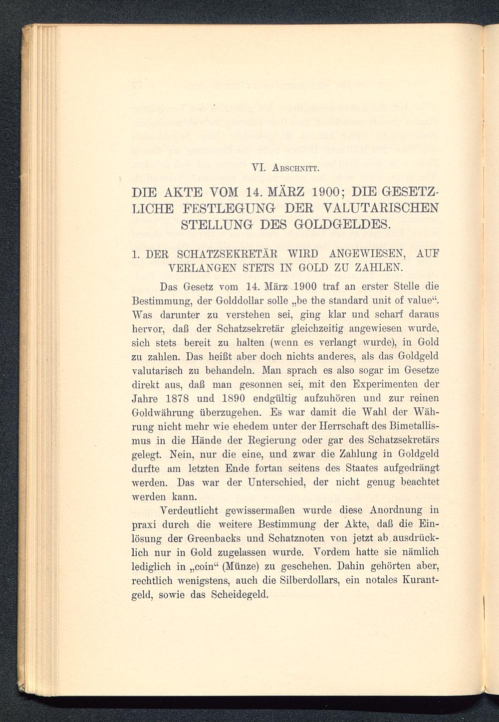Das Gesetz vom 14. März 1900 traf an erster Stelle dieBestimmung, der Golddollar solle „be the Standard unit of value“.Was darunter zu verstehen sei, ging klar und scharf daraushervor, daß der Schatzsekretär gleichzeitig angewiesen wurde,sich stets bereit zu halten (wenn es verlangt wurde), in Goldzu zahlen. Das heißt aber doch nichts anderes, als das Goldgeldvalutarisch zu behandeln. Man sprach es also sogar im Gesetzedirekt aus, daß man gesonnen sei, mit den Experimenten derJahre 1878 und 1890 endgültig aufzuhören und zur reinenGoldwährung überzugehen. Es war damit die Wahl der Wäh-rung nicht mehr wie ehedem unter der Herrschaft des Bimetallis-mus in die Hände der Regierung oder gar des Schatzsekretärsgelegt. Nein, nur die eine, und zwar die Zahlung in Goldgelddurfte am letzten Ende fortan seitens des Staates aufgedrängtwerden. Das war der Unterschied, der nicht genug beachtetwerden kann.