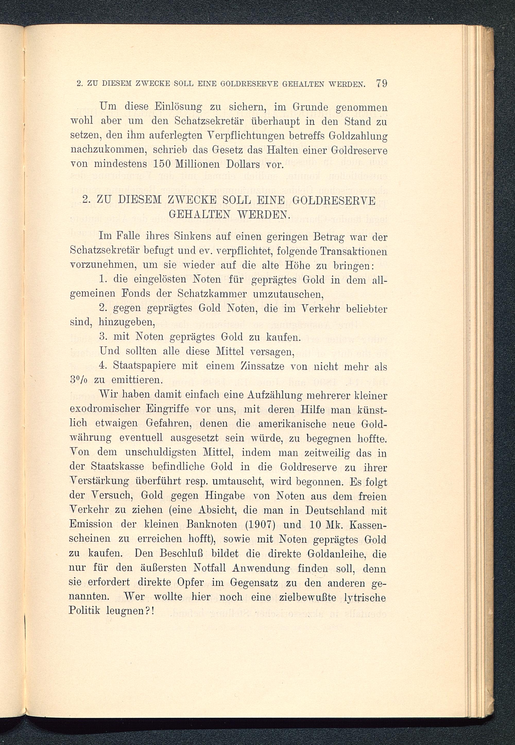 Um diese Einlösung zu sichern, im Grunde genommenwohl aber um den Schatzsekretär überhaupt in den Stand zusetzen, den ihm auferlegten Verpflichtungen betreffs Goldzahlungnachzukommen, schrieb das Gesetz das Halten einer Goldreservevon mindestens 150 Millionen Dollars vor.