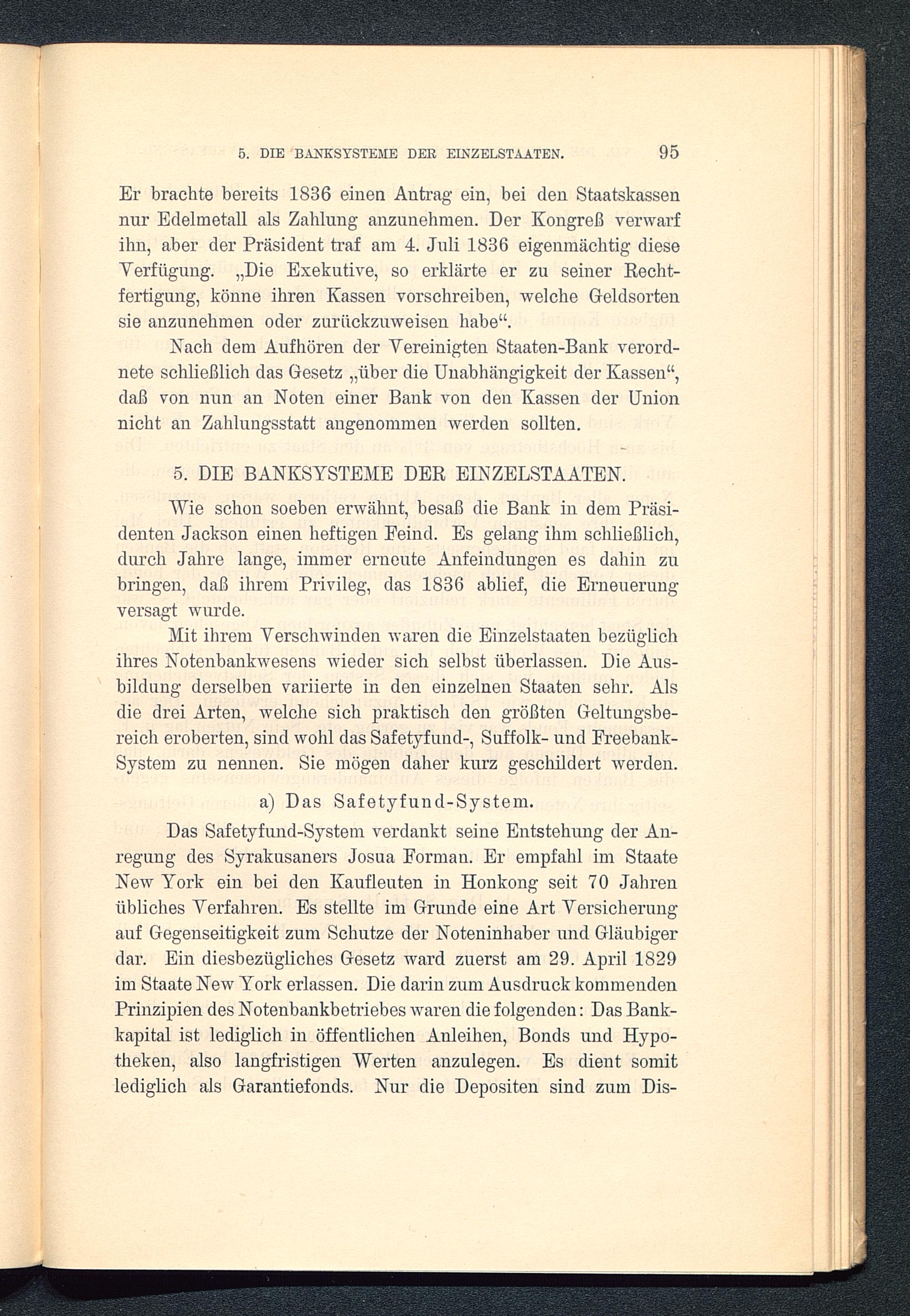 Mit ihrem Verschwinden waren die Einzelstaaten bezüglichihres Notenbankwesens wieder sich selbst überlassen. Die Aus-bildung derselben variierte in den einzelnen Staaten sehr. Alsdie drei Arten, welche sich praktisch den größten Geltungsbe-reich eroberten, sind wohl das Safetyfund-, Suffolk- und Freebank-System zu nennen. Sie mögen daher kurz geschildert werden.