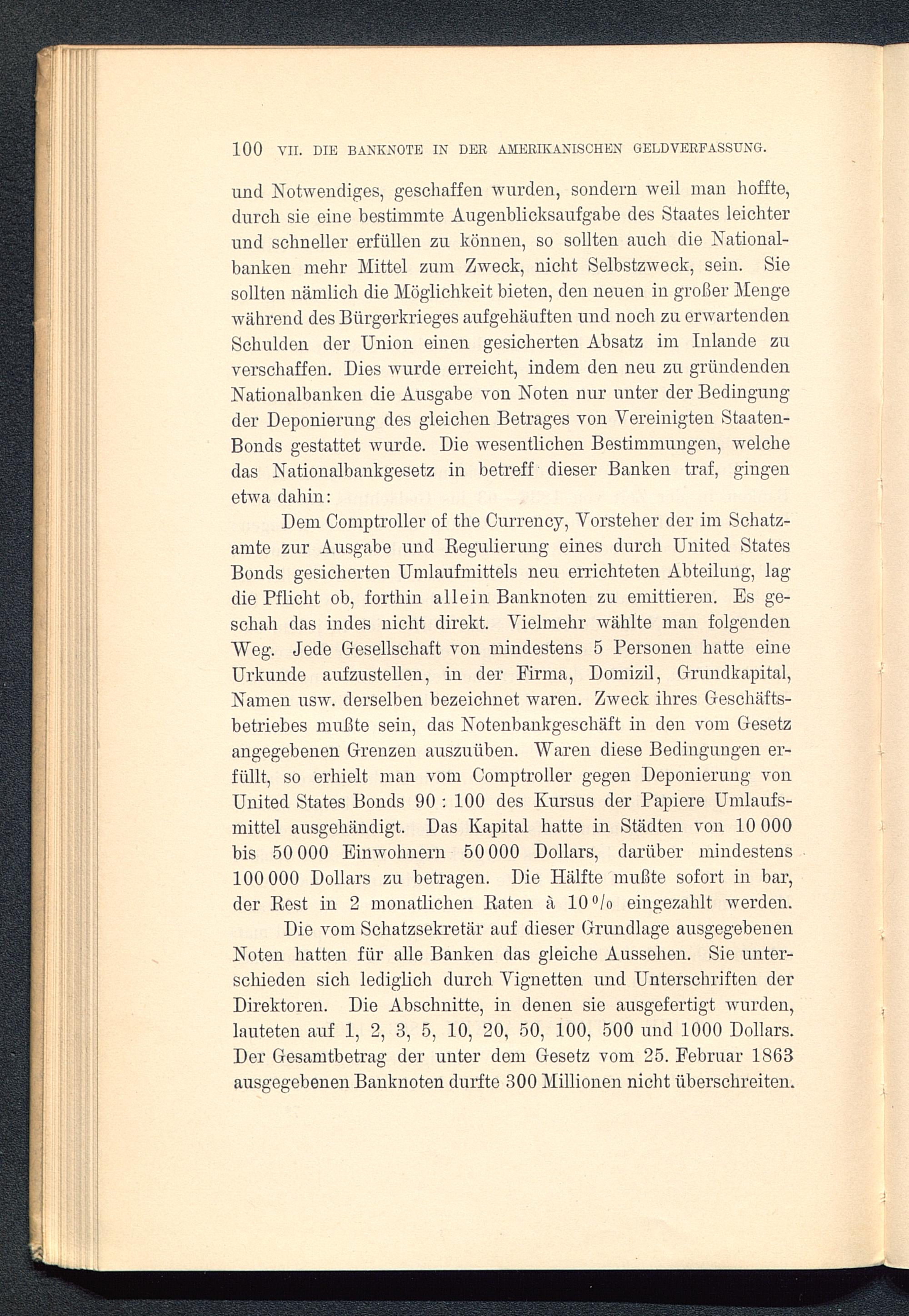 Dem Comptroller of the Currency, Vorsteher der im Schatz-amte zur Ausgabe uud Regulierung eines durch United StatesBonds gesicherten Umlaufmittels neu errichteten Abteilung, lagdie Pflicht ob, forthin allein Banknoten zu emittieren. Es ge-schah das indes nicht direkt. Vielmehr wählte man folgendenWeg. Jede Gesellschaft von mindestens 5 Personen hatte eineUrkunde aufzustellen, in der Firma, Domizil, Grundkapital,Namen usw. derselben bezeichnet waren. Zweck ihres Geschäfts-betriebes mußte sein, das Notenbankgeschäft in den vom Gesetzangegebenen Grenzen auszuüben. Waren diese Bedingungen er-füllt, so erhielt man vom Comptroller gegen Deponierung vonUnited States Bonds 90 : 100 des Kursus der Papiere Umlaufs-mittel ausgehändigt. Das Kapital hatte in Städten von 10 000bis 50 000 Einwohnern 50 000 Dollars, darüber mindestens100 000 Dollars zu betragen. Die Hälfte mußte sofort in bar,der Rest in 2 monatlichen Raten ä 10°/o eingezahlt werden.
