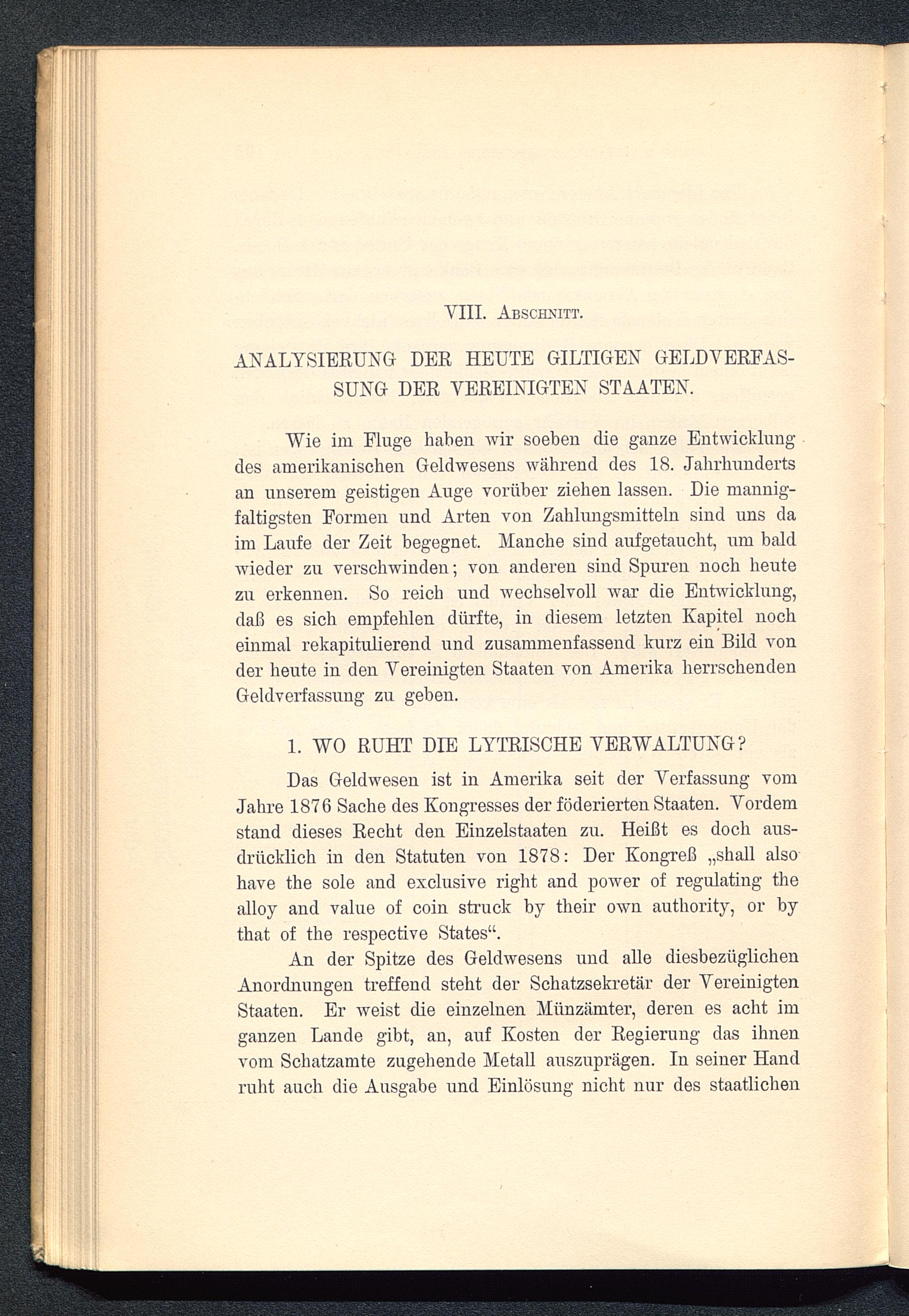 Das Geldwesen ist in Amerika seit der Verfassung vomJahre 1876 Sache des Kongresses der föderierten Staaten. Vordemstand dieses Recht den Einzelstaaten zu. Heißt es doch aus-drücklich in den Statuten von 1878: Der Kongreß „shall alsohave the sole and exclusive right and power of regulating thealloy and value of coin struck by their own authority, or bythat of the respective States“.