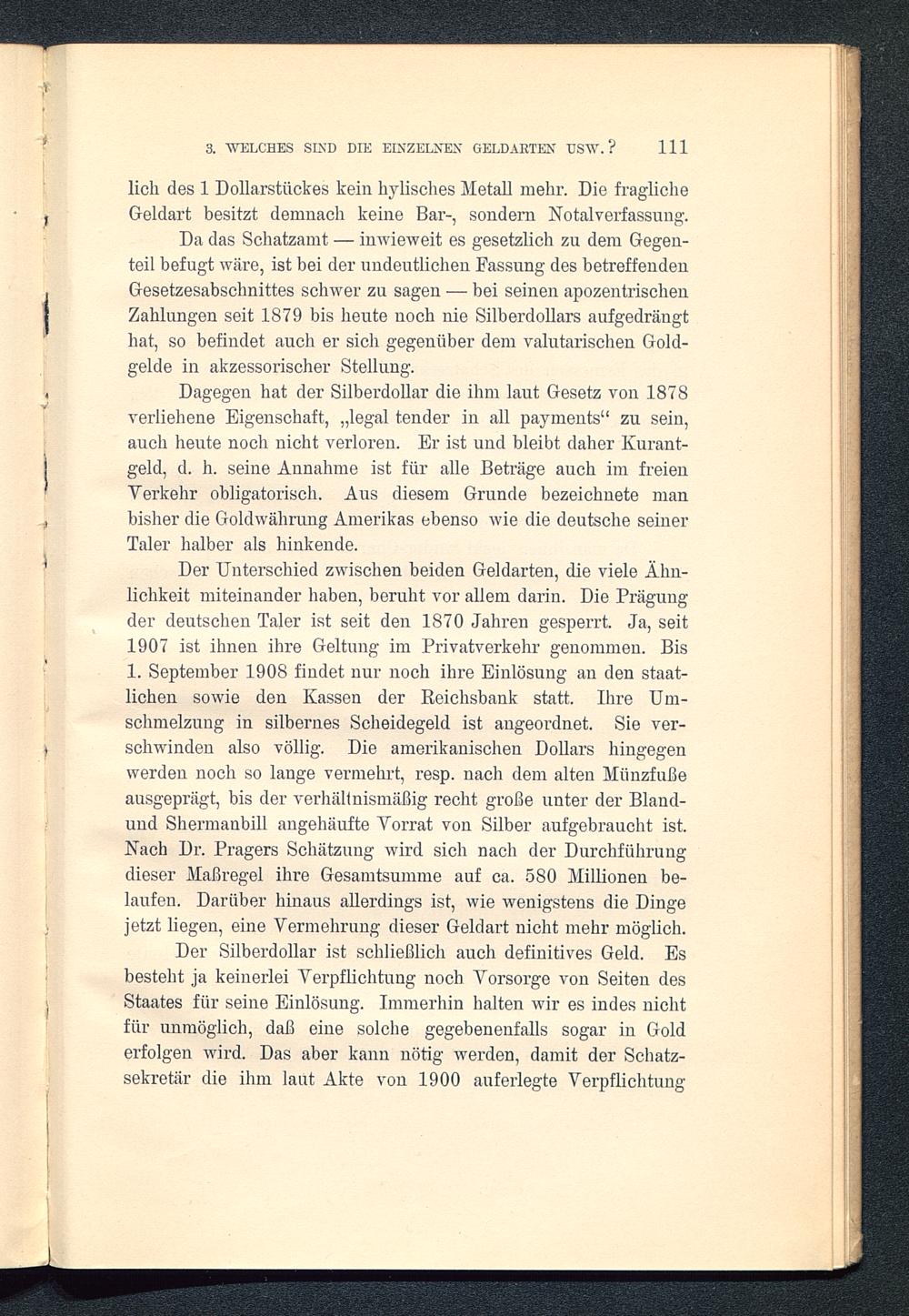 Der Unterschied zwischen beiden Geldarten, die viele Ähn-lichkeit miteinander haben, beruht vor allem darin. Die Prägungder deutschen Taler ist seit den 1870 Jahren gesperrt. Ja, seit1907 ist ihnen ihre Geltung im Privatverkehr genommen. Bis1. September 1908 findet nur noch ihre Einlösung an den staat-lichen sowie den Kassen der Reichsbank statt. Ihre Um-schmelzung in silbernes Scheidegeld ist angeordnet. Sie ver-schwinden also völlig. Die amerikanischen Dollars hingegenwerden noch so lange vermehrt, resp. nach dem alten Münzfüßeausgeprägt, bis der verhältnismäßig recht große unter der Bland-und Shermanbill angehäufte Vorrat von Silber aufgebraucht ist.Nach Dr. Pragers Schätzung wird sich nach der Durchführungdieser Maßregel ihre Gesamtsumme auf ca. 580 Millionen be-laufen. Darüber hinaus allerdings ist, wie wenigstens die Dingejetzt liegen, eine Vermehrung dieser Geldart nicht mehr möglich.