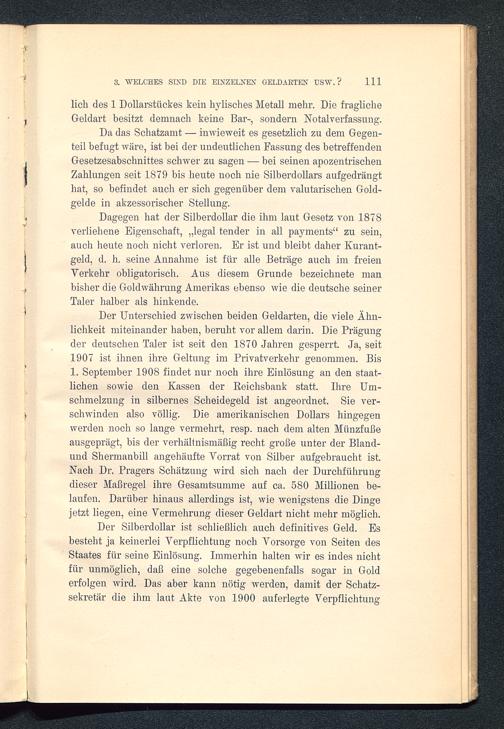 Der Silberdollar ist schließlich auch definitives Geld. Esbesteht ja keinerlei Verpflichtung noch Vorsorge von Seiten desStaates für seine Einlösung. Immerhin halten wir es indes nichtfür unmöglich, daß eine solche gegebenenfalls sogar in Golderfolgen wird. Das aber kann nötig werden, damit der Schatz-sekretär die ihm laut Akte von 1900 auferlegte Verpflichtung