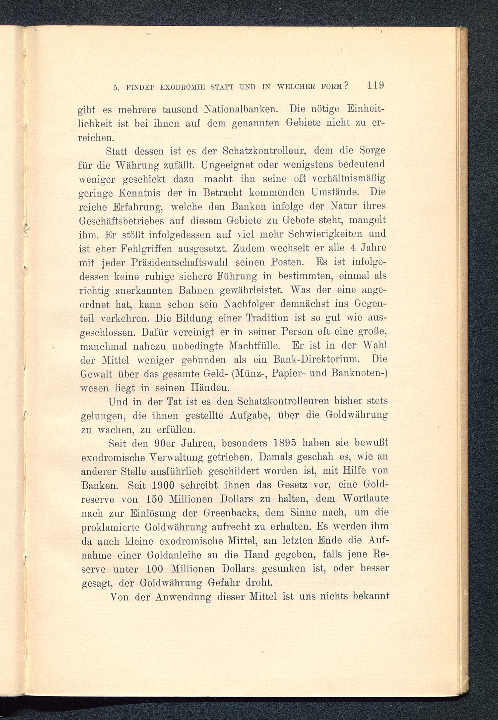 Seit den 90er Jahren, besonders 1895 haben sie bewußtexodromische Verwaltung getrieben. Damals geschah es, wie ananderer Stelle ausführlich geschildert worden ist, mit Hilfe vonBanken. Seit 1900 schreibt ihnen das Gesetz vor, eine Gold-reserve von 150 Millionen Dollars zu halten, dem Wortlautenach zur Einlösung der Greenbacks, dem Sinne nach, um dieproklamierte Goldwährung aufrecht zu erhalten. Es werden ihmda auch kleine exodromische Mittel, am letzten Ende die Auf-nahme einer Goldanleihe an die Hand gegeben, falls jene Re-serve unter 100 Millionen Dollars gesunken ist, oder bessergesagt, der Goldwährung Gefahr droht.
