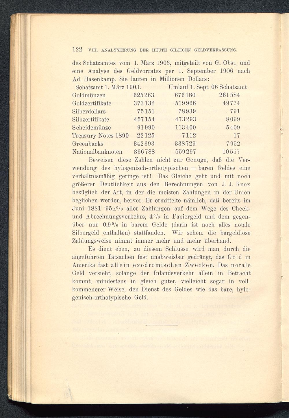 des Schatzamtes vom 1. März 1903, mitgeteilt von G. Obst, undeine Analyse des Geldvorrates per 1. September 1906 nachAd. Hasenkamp. Sie lauten in Millionen Dollars: