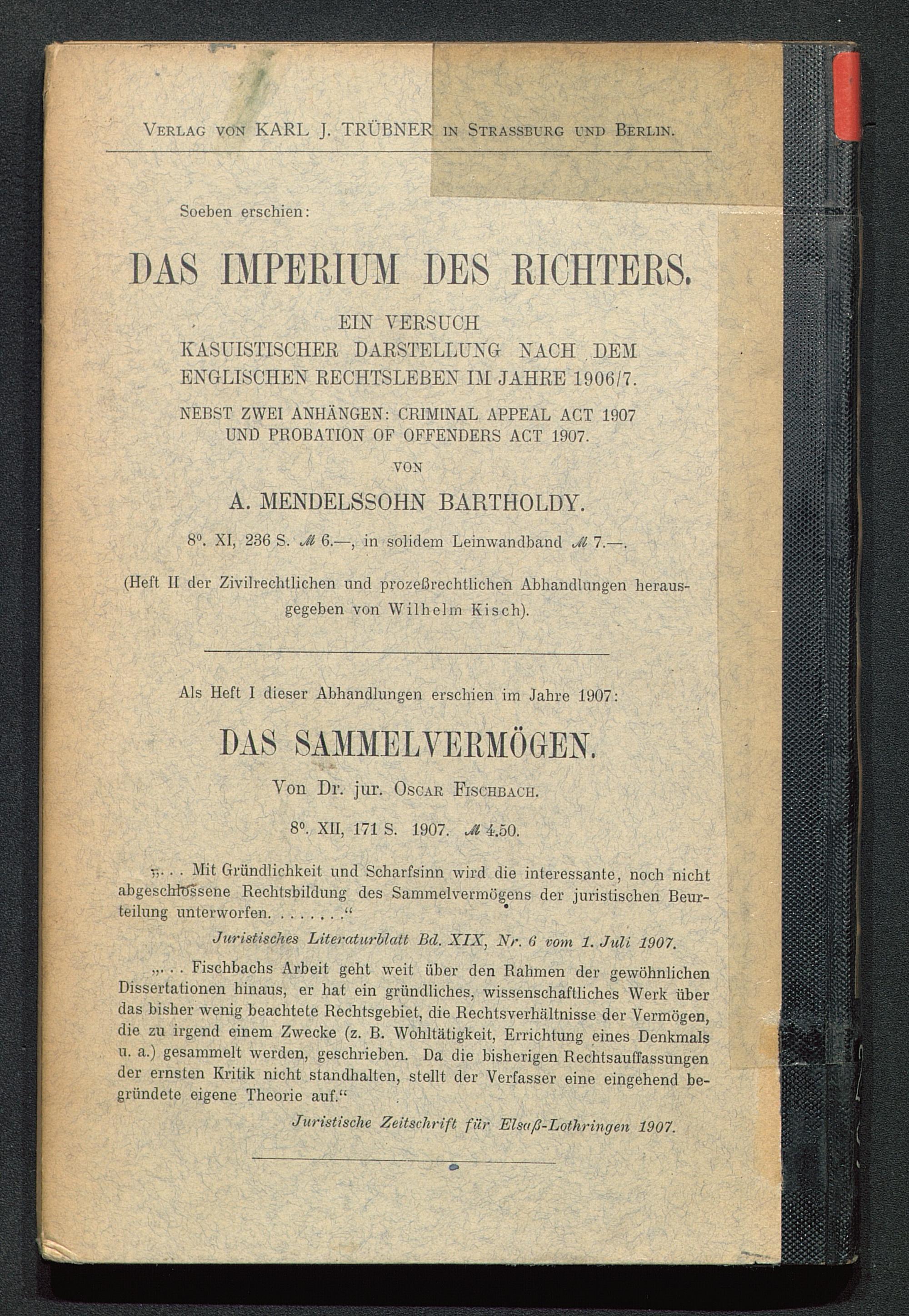 . . Fischbachs Arbeit geht weit über den Rahmen der gewöhnlichenDissertationen hinaus, er hat ein gründliches, wissenschaftliches Werk überdas bisher wenig beachtete Rechtsgebiet, die Rechtsverhältnisse der Vermögen,die zu irgend einem Zwecke (z. B. Wohltätigkeit, Errichtung eines Denkmalsu. a.) gesammelt werden, geschrieben. Da die bisherigen Rechtsauffassungender ernsten Kritik nicht standhalten, stellt der Verfasser eine eingehend be-gründete eigene Theorie auf.“