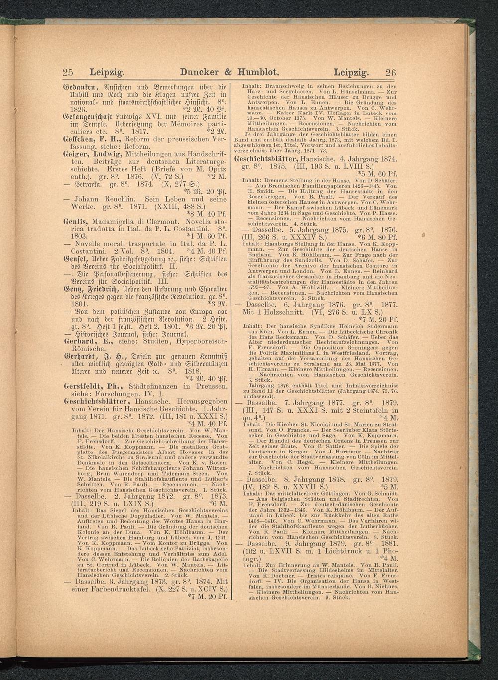 * 4 M. 40 Pf.Gerstfeldt, Ph., Städtefinanzen in Preussen,siehe: Forschungen. IV. 1.Geschichtsblätter, Hansische. Herausgegebenvom Verein für Hansische Geschichte. 1. Jahr-gang 1871. gr. 8°. 1872.( III, 181 u. XXXI S.)* 4 M. 40 Pf.Inhalt: Der Hansische Geschichtsverein. Von W. Man-tels. Die beiden ältesten hansischen Recesse. VonF. Frensdorff. Zur Geschichtschreibung der Hanse-städte. Von K. Koppmann. Die metallene Grab-platte des Bürgermeisters Albert Hövener in derSt. Nikolaikirche zu Stralsund und andere verwandteDenkmale in den Ostseeländern. Von K. v. Rosen.Die hansischen Schiffshauptleute Johann Witten-borg, Brun Warendorp und Tidemann Steen. VonW. Mantels. Die Stahlhofskaufleute und Luther'sSchriften. Von R. Pauli.. Recensionen. Nach-richten vom Hansischen Geschichtsverein.