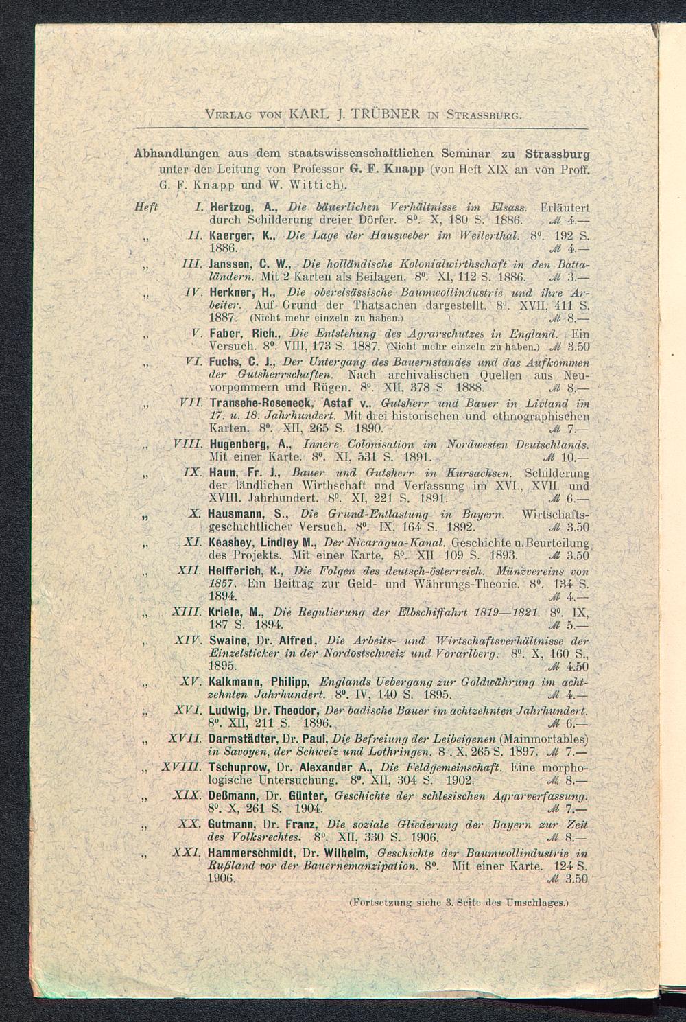 Abhandlungen aus dem staatswissenschaftlichen Seminar zu Strassburg unter der Leitung von Professor G. F. Knapp (von Heft XIX an von Proff.G. F. Knapp und W. Wittich).