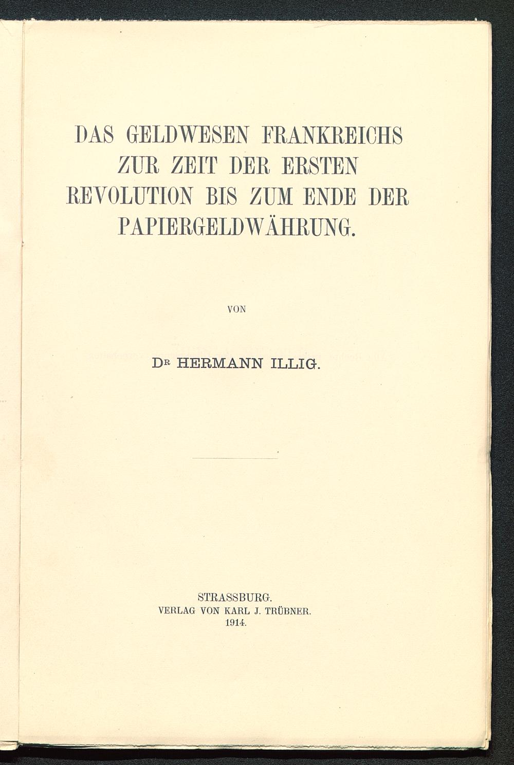 DAS GELDWESEN FRANKREICHSZUR ZEIT DER ERSTENREVOLUTION BIS ZUM ENDE DERPAPIERGELDWÄHRUNG.D« HERMANN ILLIG.STRASSBURG .VERLAG VON KARL J. TRÜHNER.1914 .