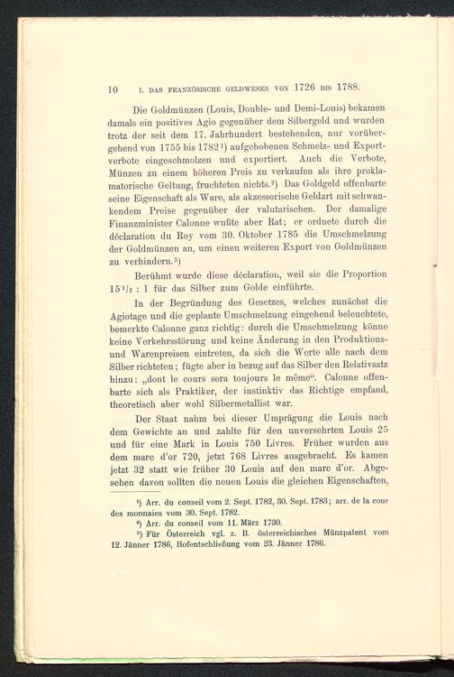 Die Goldmünzen (Louis, Double- und Demi-Louis) bekamendamals ein positives Agio gegenüber dem Silbergeld und wurdentrotz der seit dem 17. Jahrhundert bestehenden, nur vorüber-gehend von 1755 bis 1782 J ) aufgehobenen Schmelz- und Export-verbote eingeschmolzen und exportiert. Auch die Verbote,Münzen zu einem höheren Preis zu verkaufen als ihre prokla-matorische Geltung, fruchteten nichts. * 2 ) Das Goldgeld offenbarteseine Eigenschaft als Ware, als akzessorische Geldart mit schwan-kendem Preise gegenüber der valutarischen. Der damaligeFinanzminister Calonne wußte aber Rat; er ordnete durch diedöclaration du Roy vom 30. Oktober 1785 die Umschmelzungder Goldmünzen an, um einen weiteren Export von Goldmünzenzu verhindern. 3 )