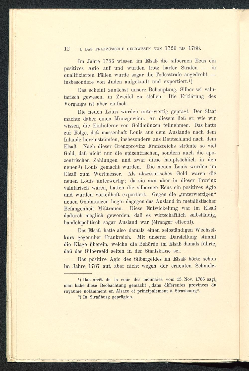 Im Jahre 1786 wiesen im Elsaß die silbernen Ecus einpositives Agio auf und wurden trotz harter Strafen — inqualifizierten Fällen wurde sogar die Todesstrafe angedroht —insbesondere von Juden aufgekauft und exportiert. 1 )