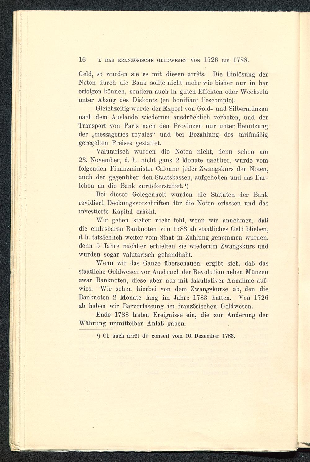Valutarisch wurden die Noten nicht, denn schon am23. November, d. h. nicht ganz 2 Monate nachher, wurde vomfolgenden Finanzminister Calonne jeder Zwangskurs der Noten,auch der gegenüber den Staatskassen, aufgehoben und das Dar-lehen an die Bank zurückerstattet. J )