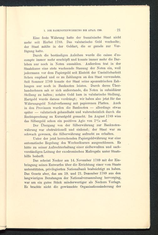 Das scheint Necker am 14. November 1789 mit der Ein-bringung seines Entwurfes über die Errichtung einer vom Staateunterstützten, privilegierten Nationalbank beabsichtigt zu haben.Das Gesetz aber, das am 19. und 21. Dezember 1789 aus denlangwierigen Beratungen der Nationalversammlung hervorging,war um ein gutes Stück minderwertiger als Neckers Vorlage.Es brachte nicht die gewünschte Organisationsänderung der