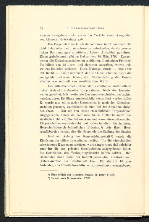 Die Frage, ob diese billets de confiance unter das staatlicheGeld fielen oder nicht, ist schwer zu entscheiden, da die gesetz-lichen Bestimmungen unmittelbar keinen Aufschluß gewähren.Einen Anhaltspunkt gibt das Dekret vom 30. März 1792. Danachwaren alle Emissionsanstalten zu revidieren. Denjenigen Privaten,die billets von 25 livres und darunter ausgaben, wurde jedeweitere Emission verboten. Diese Maßregel wurde — und zwarmit Recht — damit motiviert, daß die Gesellschaften nicht diegenügende Sicherheit boten; die Personalhaftung der Gesell-schafter war sehr oft von zweifelhaftem Wert.