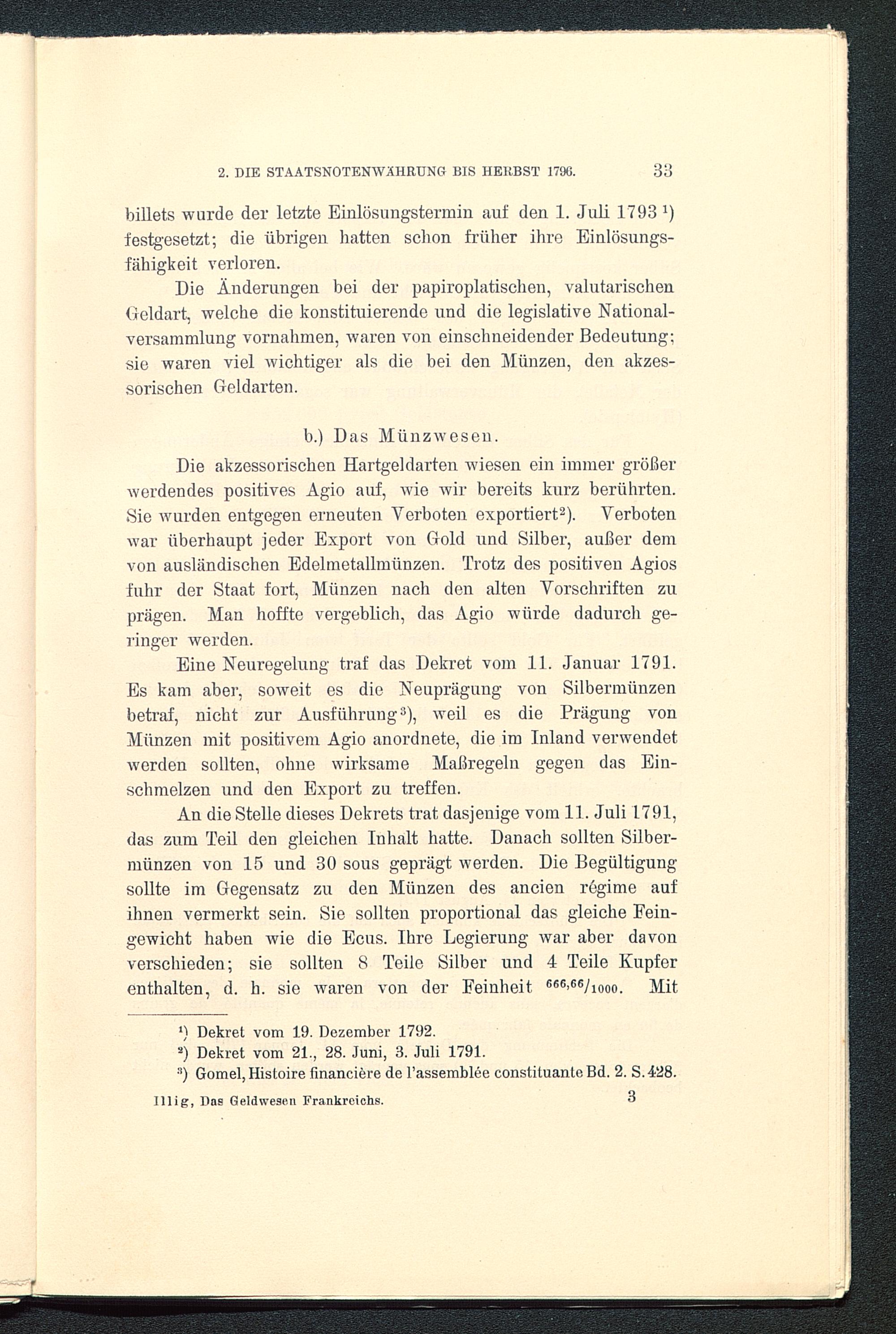 Eine Neuregelung traf das Dekret vom 11. Januar 1791.Es kam aber, soweit es die Neuprägung von Silbermünzenbetraf, nicht zur Ausführung 3 ), weil es die Prägung vonMünzen mit positivem Agio anordnete, die im Inland verwendetwerden sollten, ohne wirksame Maßregeln gegen das Ein-schmelzen und den Export zu treffen.