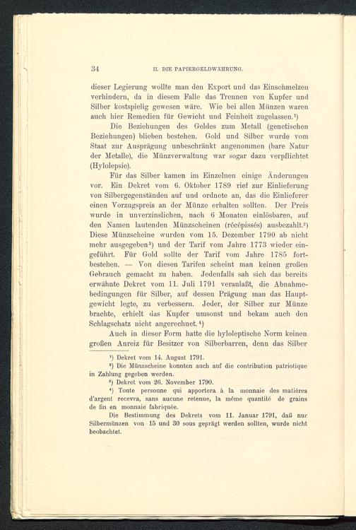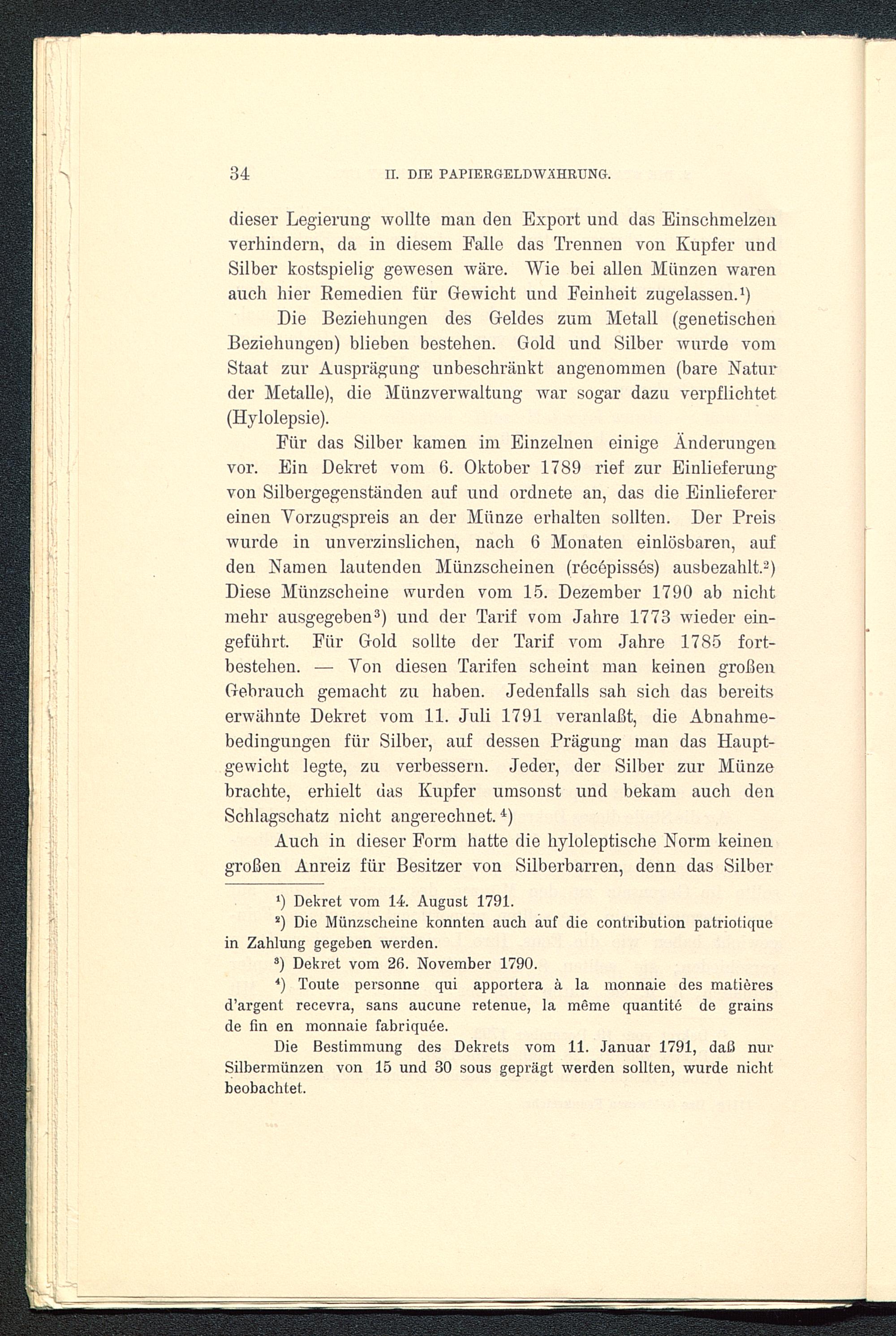 Für das Silber kamen im Einzelnen einige Änderungenvor. Ein Dekret vom 6. Oktober 1789 rief zur Einlieferungvon Silbergegenständen auf und ordnete an, das die Einlieferereinen Vorzugspreis an der Münze erhalten sollten. Der Preiswurde in unverzinslichen, nach 6 Monaten einlösbaren, aufden Namen lautenden Münzscheinen (recepisses) ausbezahlt. 2 )Diese Münzscheine wurden vom 15. Dezember 1790 ab nichtmehr ausgegeben 3 ) und der Tarif vom Jahre 1773 wieder ein-geführt. Für Gold sollte der Tarif vom Jahre 1785 fort-bestehen. — Yon diesen Tarifen scheint man keinen großenGebrauch gemacht zu haben. Jedenfalls sah sich das bereitserwähnte Dekret vom 11. Juli 1791 veranlaßt, die Abnahme-bedingungen für Silber, auf dessen Prägung man das Haupt-gewicht legte, zu verbessern. Jeder, der Silber zur Münzebrachte, erhielt das Kupfer umsonst und bekam auch denSchlagschatz nicht angerechnet. 4 )