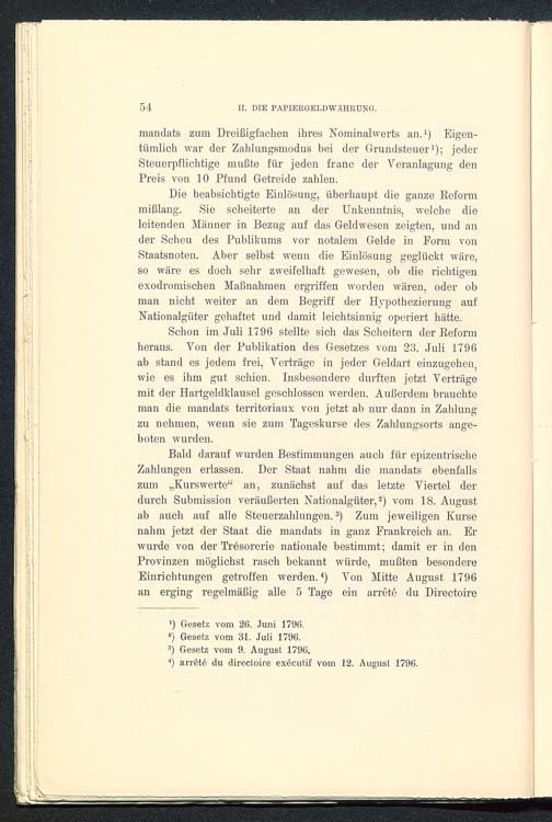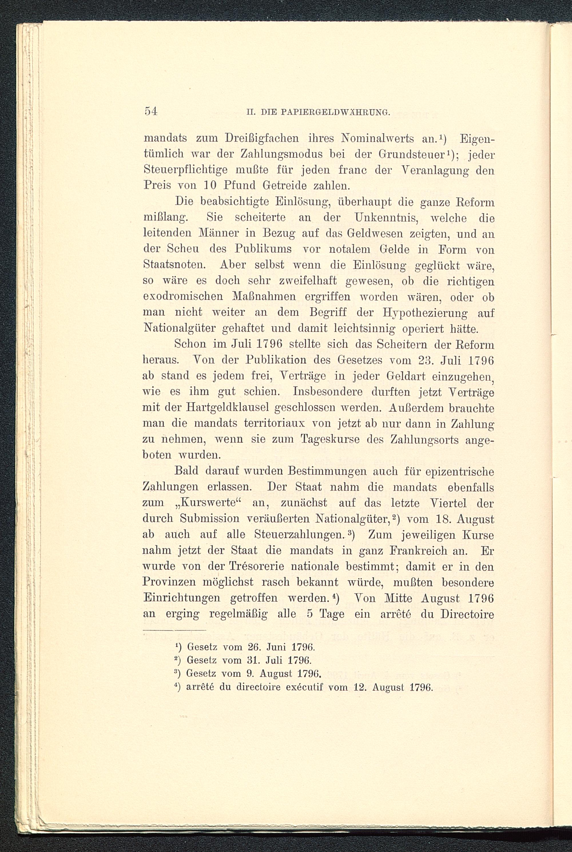 Schon im Juli 1796 stellte sich das Scheitern der Reformheraus. Ton der Publikation des Gesetzes vom 23. Juli 1796ab stand es jedem frei, Verträge in jeder Geldart einzugeheiywie es ihm gut schien. Insbesondere durften jetzt Verträgemit der Hartgeldklausel geschlossen werden. Außerdem brauchteman die mandats territoriaux von jetzt ab nur dann in Zahlungzu nehmen, wenn sie zum Tageskurse des Zahlungsorts ange-boten wurden.