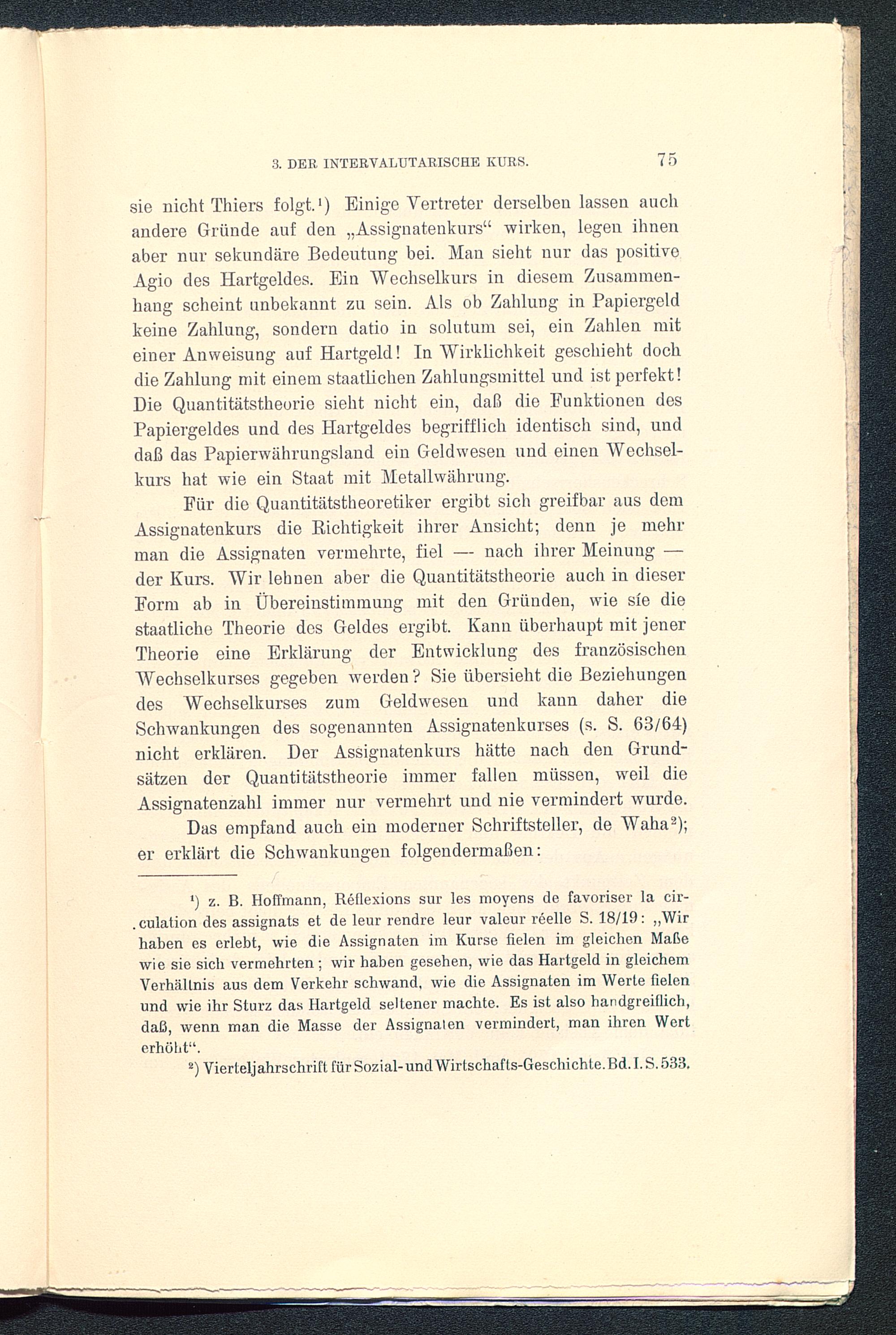 sie nicht Thiers folgt. 1 ) Einige Vertreter derselben lassen auchandere Gründe auf den „Assignatenkurs“ wirken, legen ihnenaber nur sekundäre Bedeutung bei. Man sieht nur das positiveAgio des Hartgeldes. Ein Wechselkurs in diesem Zusammen-hang scheint unbekannt zu sein. Als ob Zahlung in Papiergeldkeine Zahlung, sondern datio in solutum sei, ein Zahlen miteiner Anweisung auf Hartgeld! In Wirklichkeit geschieht dochdie Zahlung mit einem staatlichen Zahlungsmittel und ist perfekt!Die Quantitätstheorie sieht nicht ein, daß die Funktionen desPapiergeldes und des Hartgeldes begrifflich identisch sind, unddaß das Papierwährungsland ein Geldwesen und einen Wechsel-kurs hat wie ein Staat mit Metallwährung.