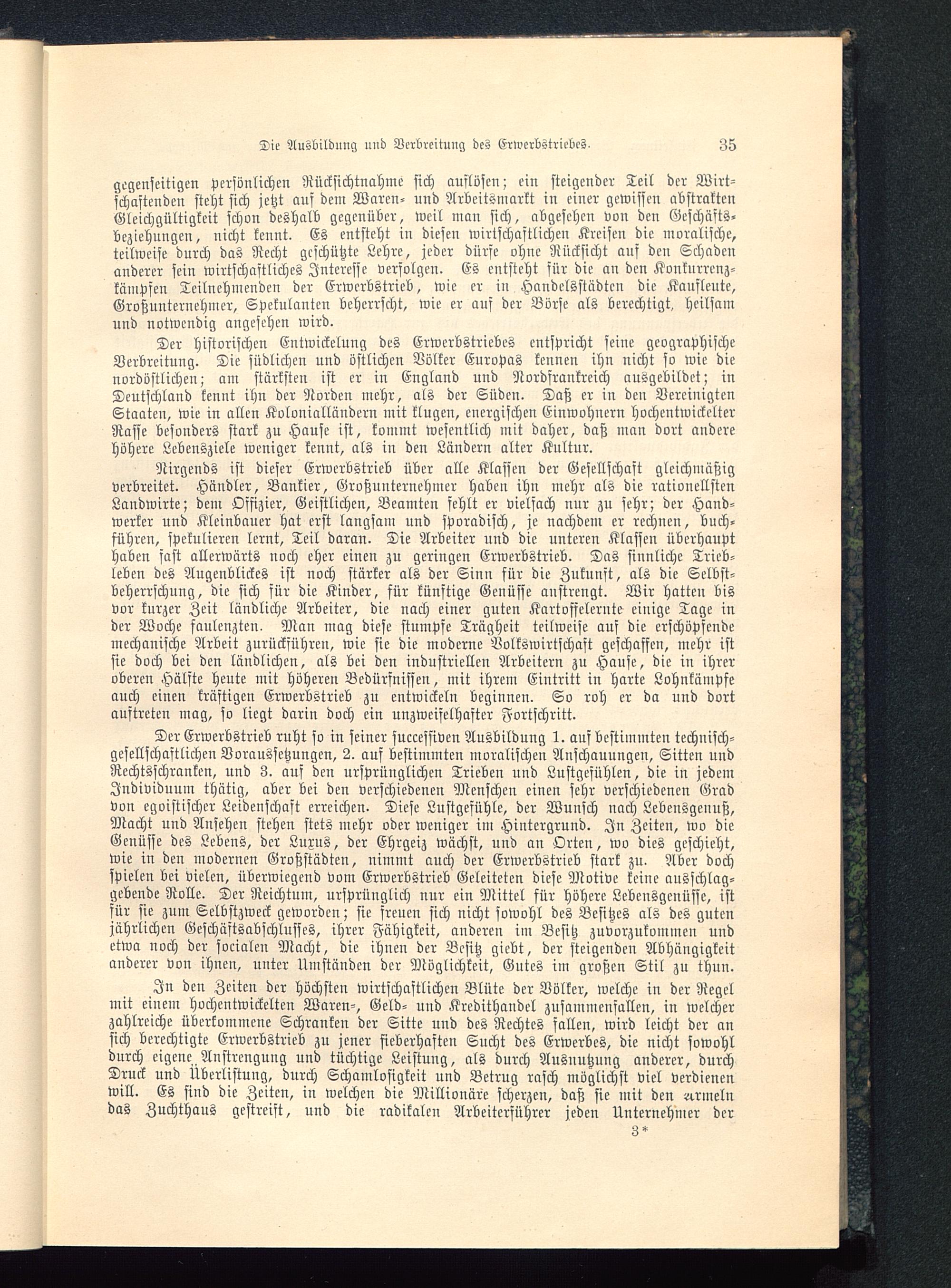 Der historischen Entwickelung des Erwerbstriebes entspricht seine geographischeVerbreitung. Die südlichen und östlichen Völker Europas kennen ihn nicht so wie dienordöstlichen; am stärksten ist er in England und Nordfrankreich ausgebildet; inDeutschland kennt ihn der Norden mehr, als der Süden. Daß er in den VereinigtenStaaten , wie in allen Kolonialländern mit klugen, energischen Einwohnern hochentwickelterRasse besonders stark zu Hause ist, kommt wesentlich mit daher, daß man dort anderehöhere Lebensziele weniger kennt, als in den Ländern alter Kultur.