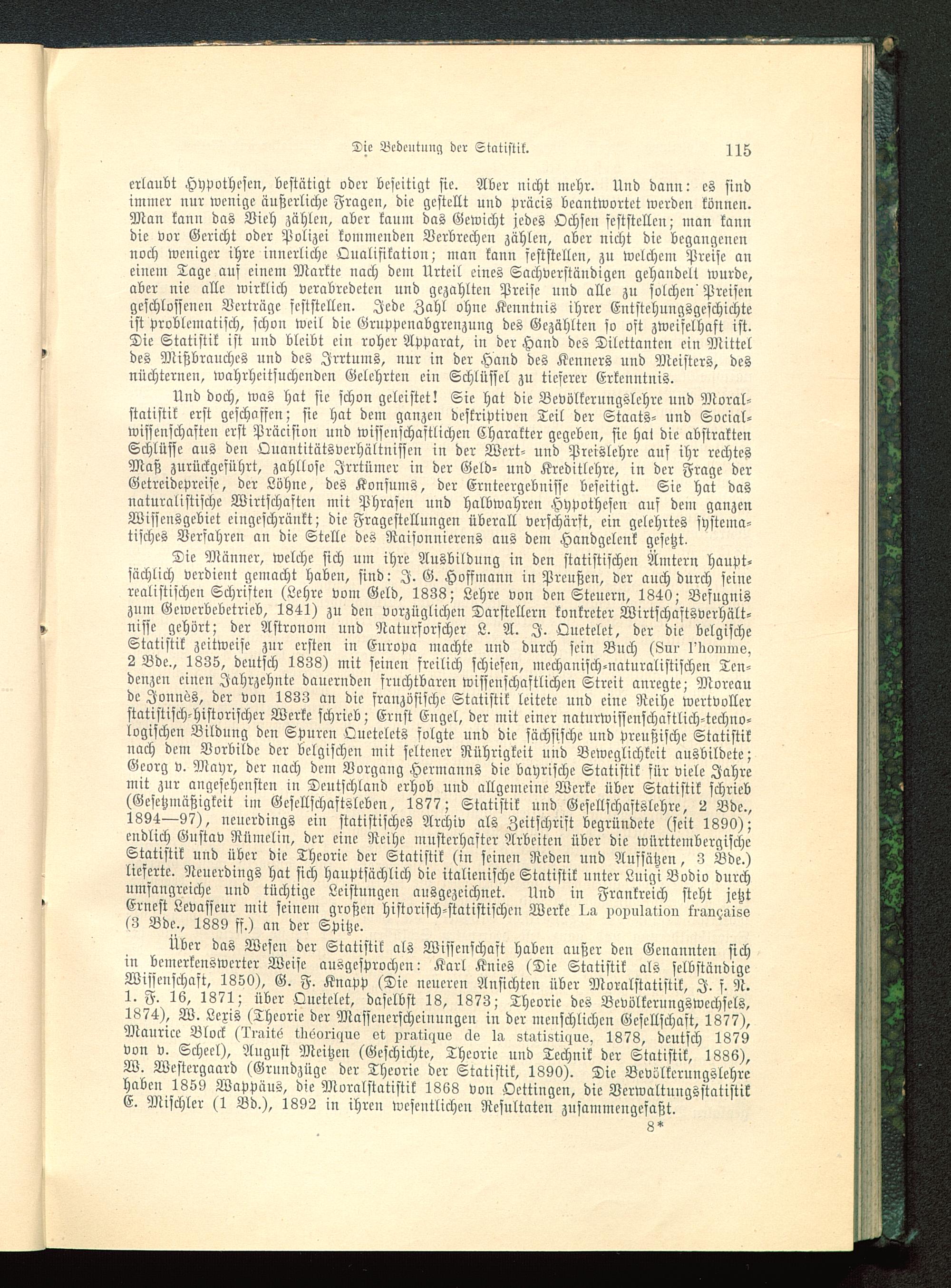 Über das Wesen der Statistik als Wissenschaft haben außer den Genannten sichin bemerkenswerter Weise ausgesprochen: Karl Knies (Die Statistik als selbständigeWissenschaft, 1850), G. F. Knapp (Die neueren Ansichten über Moralstatistik, I. s. N.1. F. 16, 1871; über Quetelet , daselbst 18, 1873; Theorie des Bevölkerungswcchsels,1874), W. Lexis (Theorie der Masscnerscheinungen in der menfchlichen Gesellschaft, 1877),Manrice Block (1rait6 tliöoricius et xratiauö äs 1a. statisti^ue, 1878, deutsch 1879von v. Scheel), August Mcitzen (Geschichte, Theorie und Technik der Statistik, 1886),W. Wcstcrgaard (Grundzüge der Theorie der Statistik, 1890). Die Bevolkcrungslehrehaben 1859 Wappüus, die Moralstatistik 1868 von Octtingen, die VcrwaltungsstatistikE. Mischler (1 Bd.), 1892 in ihren wesentlichen Resultaten zusammengefaßt.