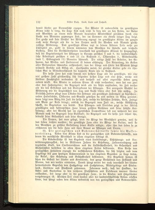 Die Erdoberfläche ist das Ergebnis eines Umbildungs-, Schichtungs- und Ver-witterungsprozesses, der in Millionen Jahren die Erhebung, Zusammensetzung undvegetative Kraft, den Quellenreichtum und die Luftbeschaffenheit, die Gesundheit undWohnlichkeit derselben in allen ihren einzelnen Teilen bestimmte. Eine Reihe vongeologischen Zeitaltern erzeugte die verschiedenen Schichten, die sich folgten und vomUrgebirge bis zum heutigen Schwemmland in den einzelnen Gegenden zu Tage treten,ihr Relief, ihre Erhebung und Beschaffenheit bestimmen. Ein Ergebnis hievon istschon die Gestalt der Länder und Kontinente, das ganze Verhältnis von Festland undMeeren, das wir vorhin erörterten. Damit hängt weiter der auch innerhalb der Länderhervortretende Gegensatz von Hochgebirge und Hochplateau, Mittelgebirge und Stufcn-land, Tiefebene und Flachland zusammen. Jederman weiß, daß der Hackbau, derAcker- und Gartenbau in den reicheren Flußthälern und Tiefebenen warmer Länderentstanden, feit lange aber in die gemäßigte Zone, in die Stufen- und Hügelländervorgedrungen ist. Welchen Teil eines Landes aber der landwirtschaftliche Anbau erfassenkönne, das hängt neben dem Klima wesentlich von den geologischen und Bodenverhält-