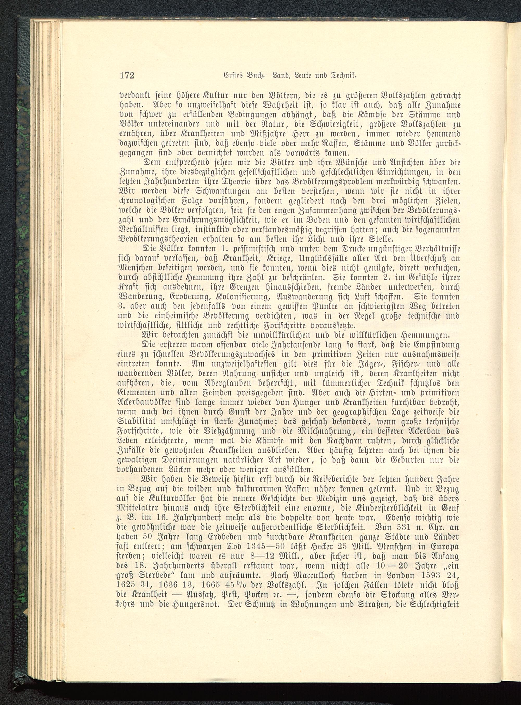 Die Völker konnten 1. pessimistisch und unter dem Drucke ungünstiger Verhältnissesich darauf verlassen, daß Krankheit, Kriege, Unglücksfälle aller Art den Überschuß anMenschen beseitigen werden, und sie konnten, wenn dies nicht genügte, direkt versuchen,durch absichtliche Hemmung ihre Zahl zu beschränken. Sie konnten 2. im Gefühle ihrerKraft sich ausdehnen, ihre Grenzen hinausschieben, fremde Länder unterwerfen, durchWanderung, Eroberung, Kolonisierung, Auswanderung sich Luft schaffen. Sie konnten3. aber auch den jedenfalls von einem gewissen Punkte an schwierigsten Weg betretenund die einheimische Bevölkerung verdichten, was in der Regel große technische undwirtschaftliche, sittliche und rechtliche Fortschritte voraussetzte.