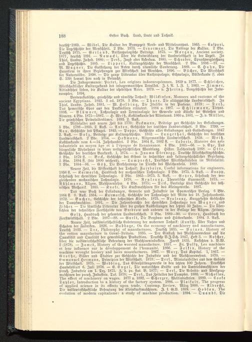 Mittelalter und neuere Zeit bis 1770: Beckmann, Beiträge zur Geschichte der Erfiuduugcn.5 Bde. 1786-1805. 2. Aufl. — Anton, Geschichte der teutschen Landwirtschaft. 3 Bde. 1799. —Ran, Geschichte des Pfluges. 1845.— Pvppc, Geschichte aller Erfindungen und Entdeckungen. 18472. Aufl. — Volz, Beiträge zur Kulturgeschichte. 1852. — Langethal, Geschichte der deutschenLandwirtschaft. 2 Bde. 1854. — Nvstmann, Altgcrmanische Landwirtschaft. 1859. — Weiß,Kostümkundc vom 4.-14. Jahrhundert. 2 Bde. 1864 ff., 1882 ff. — Labarte, llistoiis äss artsinäustrisls au moxen A,ßs et ä 1'epoo.us äs lisnaissanes. 4 Bde. 1865—66. — v. Ehe, Dasbürgerliche Wohnhaus iu seiner weltgeschichtlichen Wandlung. Histor. Taschenbuch 1868. — Otte,Geschichte der deutschen Baukunst. 1, 1874.— v. Jnama Stern egg, Deutsche Wirtschaftsgeschichte.3 Bde. 1879 ff. — Beck, Geschichte des Eisens in technischer und kulturgeschichtlicher Beziehung.3 Bde. 1884 ff. (bis 1800 reichend). — Lamprecht , Deutsches Wirtschaftsleben im Mittelalter.3 Bde. 1884—86. — Götz, Die Verkehrswege im Dienste des Welthandels. 1888.