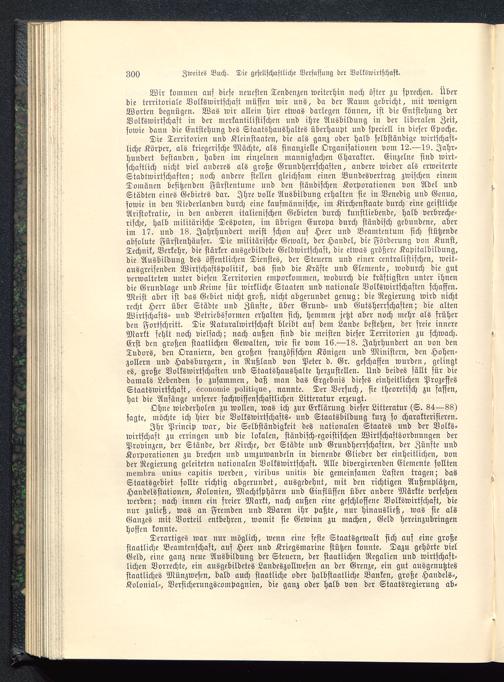 Wir kommen auf diese neuesten Tendenzen weiterhin noch öfter zu sprechen. Überdie territoriale Volkswirtschaft müssen wir uns, da der Raum gebricht, mit wenigenWorten begnügen. Was wir allein hier etwas darlegen können, ist die Entstehung derVolkswirtschaft in der merkantilistischen und ihre Ausbildung in der liberalen Zeit,sowie dann die Entstehung des Staatshaushaltes überhaupt und speciell in dieser Epoche.
