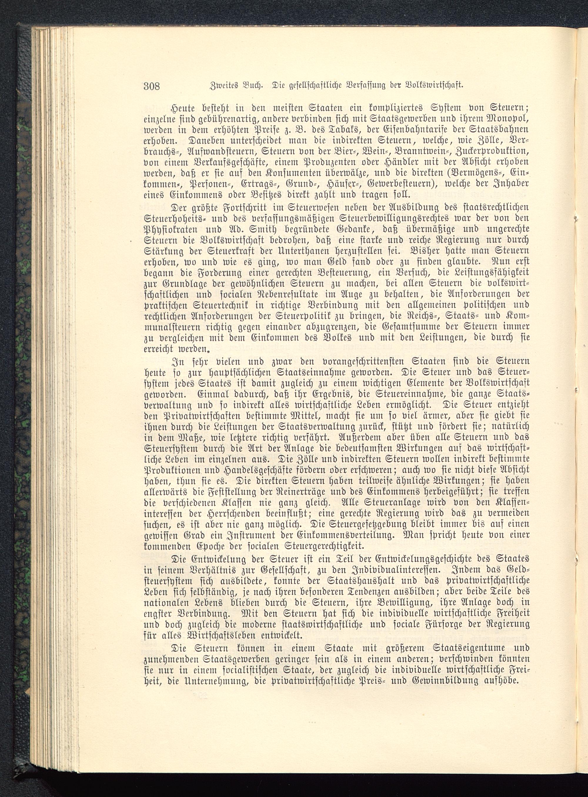 Der größte Fortschritt im Steuerwcsen neben der Ausbildung des staatsrechtlichenStcuerhoheits- und des verfassungsmäßigen Steuerbewilligungsrechtes war der von denPhysiokraten uud Ad. Smith begründete Gedanke, daß übermäßige und ungerechteSteuern die Volkswirtschaft bedrohen, daß eine starke und reiche Regierung nur durchStärkung der Steuerkraft der Unterthanen herzustellen sei. Bisher hatte man Steuernerhoben, wo und wie es ging, wo man Geld fand oder zu finden glaubte. Nun erstbegann die Forderung einer gerechten Besteuerung, ein Versuch, die Leistungsfähigkeitzur Grundlage der gewöhnlichen Steuern zu machen, bei allen Steuern die volkswirt-schaftlichen und socialen Nebenresultate im Auge zu behalten, die Anforderungen derpraktischen Steuertechnik in richtige Verbindung mit den allgemeinen politischen undrechtlichen Anforderungen der Steuerpolitik zu bringen, die Reichs-, Staats- und Kom-munalsteuern richtig gegen einander abzugrenzen, die Gesamtsumme der Steuern immerzu vergleichen mit dem Einkommen des Volkes und mit den Leistungen, die durch sieerreicht werden.