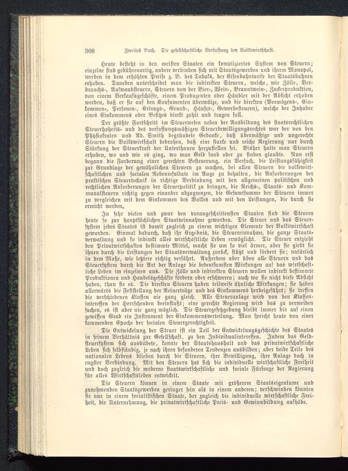 Heute besteht in den meisten Staaten ein kompliziertes System von Steuern;einzelne sind gebührenartig, andere verbinden sich mit Staatsgewerben und ihrem Monopol,werden in dem erhöhten Preise z. B. des Tabaks, der Eisenbahntarife der Staatsbahnenerhoben. Daneben unterscheidet man die indirekten Steuern, welche, wie Zölle, Ver-brauchs-, Aufwandsteuern, Steuern von der Bier-, Wein-, Branntwein-, Zuckerproduktion,von einem Verkaufsgeschüfte, einem Produzenten oder Händler mit der Absicht erhobenwerden, daß er sie auf den Konsumenten überwälze, und die direkten (Vermögens-, Ein-kommen-, Personen-, Ertrags-, Grund-, Häuser-, Gewerbesteuern), welche der Inhabereines Einkommens oder Besitzes direkt zahlt und tragen soll.