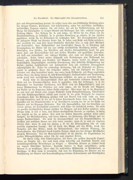Hof- und Kriegsverwaltung heraus; sie müssen dann aber eine selbständige Stellung nebenden übrigen Central-, Provinzial- und Lokalbehördcn, neben den politischen, juristischen,militärischen Organen erhalten, sich mit diesen, wie mit der Volksvertretung, mit derMenge der Steuerzahler in langein Kampfe und Reibungen ihre feste, rechtlich umgrenzteStellung sichern. Der Auftrag für sie geht dahin, die Mittel für den Staat und dieStaatsverwaltung zn beschaffen, sie in gerechter Verteilung zu erheben, sie den Zweckenzuzuführen, welche für die Gesamtheit die wichtigsten sind. Die Finanzbehörden habendie zwingende Macht des Staates hinter sich, sie sollen nach Recht und Gesetz Verfahren;aber unendlich viel muß stets ihrem Gutdünken überlassen sein; je nach ihrer Weisheitund Rechtlichkeit, ihrer Beschränktheit und Unredlichkeit können sie in Erhebung undVerausgabung der Mittel fast wie eine irdische wirtschaftliche Vorsehung walten. AlleBeteiligten, vom Fürsten , den Ministern und obersten Finanzbehörden herab bis zumletzten Zoll- und Steueraufseher sind und bleiben Menschen mit egoistischen Interessen,mit Haß und Leidenschaft, mit richtiger Einsicht, aber auch mit Irrtum und Sach-unkenntnis. Daher immer wieder Fehlgriffe und Versuchungen zum Mißbrauch derGewalt, zur Erpressung von Diensten uud Abgaben, immer wieder die Klagen überNachlässigkeit, Ungerechtigkeit, unredliche Bereicherung, über fiskalische Mißhandlung desVolkes, welchen Jahrhunderte und Jahrtausende lang jede entwickelte Finanzgewaltanheimgefallen ist. Daher die notwendige Forderung, daß alle Ansprüche der Finanz-gewalt in gesetzlicher Form sich vollziehen müssen, daß alle Thätigkeit der Finanz-behörden von oben kontrolliert werde, von unten durch Beschwerde und Klage angefochtenwerden könne; die Folge hievon ist, daß Schwerfälligkeit, Umständlichkeit und Verteuerung,welche durch diese unerläßlichen Anordnungen entstehen, nie ganz zu vermeiden sind.