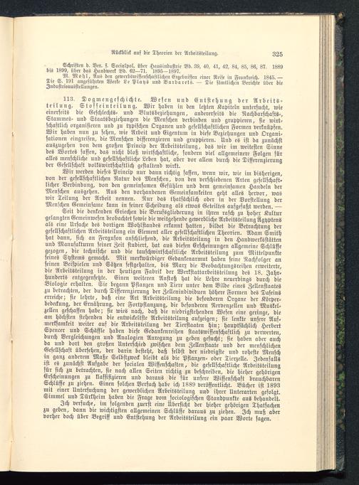 113. Dogmengeschichte. Wesen und Entstehung der Arbeits-teilung. Stoffeinteilung. Wir haben in den letzten Kapiteln untersucht, wieeinerseits die Geschlechts- und Blutsbeziehungen, andererseits die Nachbarschafts-,Stammes- und Staatsbeziehungen die Menschen verbinden und gruppieren, sie wirt-schaftlich organisieren und zu typischen Organen und gesellschaftlichen Formen verknüpfen.Wir haben nun zu sehen, wie Arbeit und Eigentum in diese Beziehungen und Organi-sationen eingreifen, die Menschen differenzieren und gruppieren. Und es ist da zunächstauszugehen von dem großen Princip der Arbeitsteilung, das wir im weitesten Sinnedes Wortes fassen, das nicht bloß wirtschaftliche, sondern viel allgemeinere Folgen füralles menschliche und gesellschaftliche Leben hat, aber vor allem durch die Differenzierungder Gesellschaft volkswirtschaftlich gestaltend wirkt.