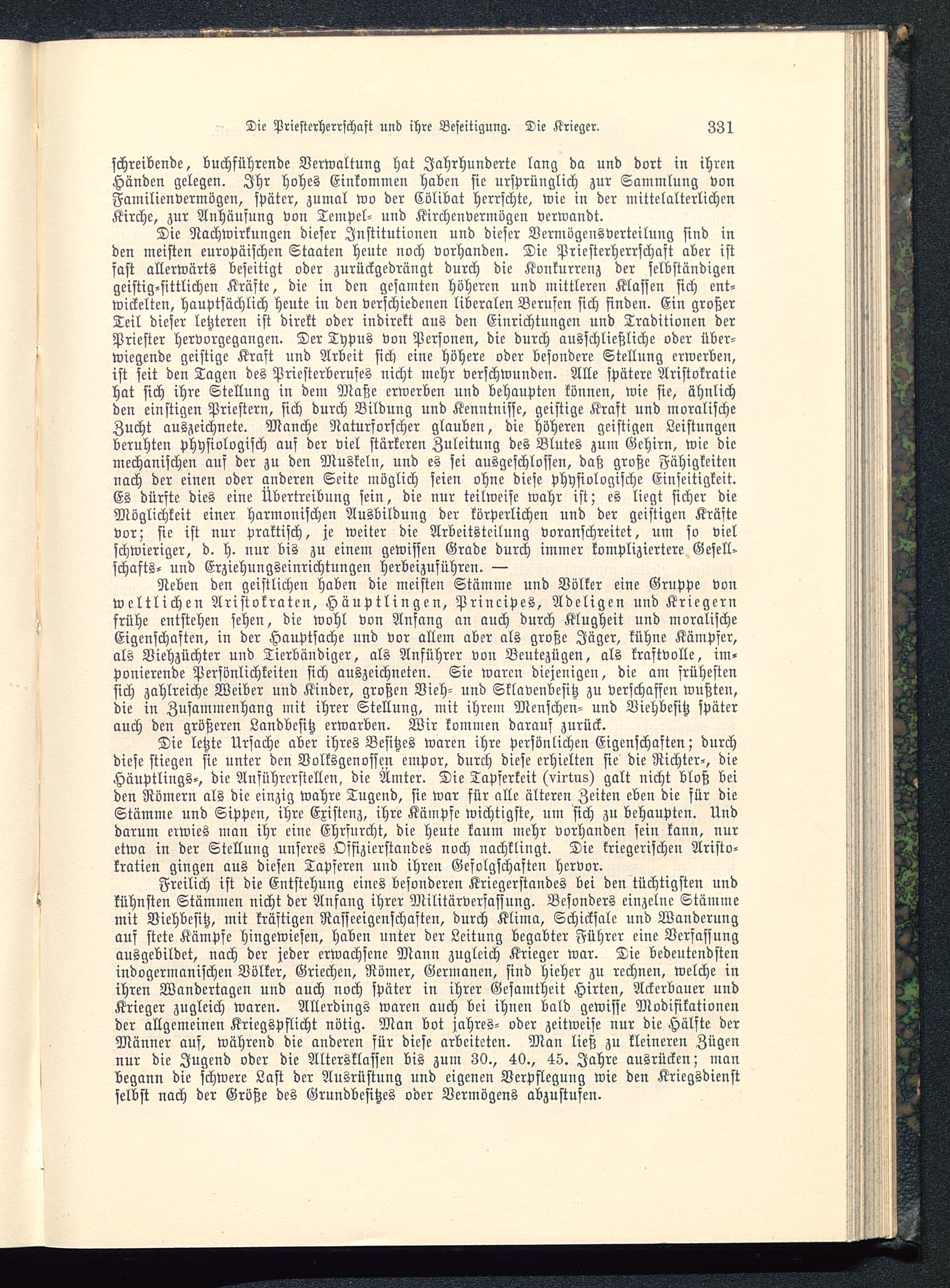 Die letzte Ursache aber ihres Besitzes waren ihre persönlichen Eigenschaften; durchdiese stiegen sie unter den Volksgenossen empor, durch diese erhielten sie die Richter-, dieHäuptlings-, die Anführerstellen, die Ämter. Die Tapferkeit (virtus) galt nicht bloß beiden Römern als die einzig wahre Tugend, sie war für alle älteren Zeiten eben die für dieStämme und Sippen, ihre Existenz, ihre Kämpfe wichtigste, um sich zu behaupten. Unddarum erwies man ihr eine Ehrfurcht, die heute kaum mehr vorhanden sein kann, nuretwa in der Stellung unseres Offizierstandes noch nachklingt. Die kriegerischen Aristo-kratien gingen aus diesen Tapferen und ihren Gefolgschaften hervor.
