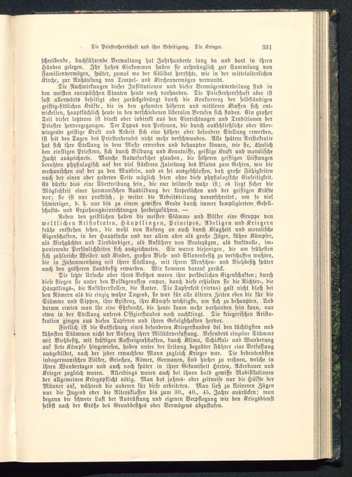 Die Nachwirkungen dieser Institutionen und dieser Vermögensverteiluug sind inden meisten europäischen Staaten heute noch vorhanden. Die Priesterherrschaft aber istfast allerwärts beseitigt oder zurückgedrängt durch die Konkurrenz der selbständigengeistig-sittlichen Kräfte, die in den gesamten höheren und mittleren Klassen sich ent-wickelten, hauptsächlich heute in den verschiedenen liberalen Berufen sich finden. Ein großerTeil dieser letzteren ist direkt oder indirekt aus den Einrichtungen und Traditionen derPriester hervorgegangen. Der Typus von Personen, die durch ausschließliche oder über-wiegende geistige Kraft und Arbeit sich eine höhere oder besondere Stellung erwerben,ist seit den Tagen des Priesterbcrufes nicht mehr verschwunden. Alle spätere Aristokratiehat sich ihre Stellung in dem Maße erwerben und behaupten können, wie sie, ähnlichden einstigen Priestern, sich durch Bildung und Kenntnisse, geistige Krast und moralischeZucht auszeichnete. Manche Naturforscher glauben, die höheren geistigen Leistungenberuhten physiologisch auf der viel stärkeren Zuleitung des Blutes zum Gehirn, wie diemechanischen auf der zu den Muskeln, und es sei ausgeschlossen, daß große Fähigkeitennach der einen oder anderen Seite möglich seien ohne diese physiologische Einseitigkeit.Es dürfte dies eine Übertreibung sein, die nur teilweise wahr ist; es liegt sicher dieMöglichkeit einer harmonischen Ausbildung der körperlichen und der geistigen Kräftevor; sie ist nur praktisch, je weiter die Arbeitsteilung voranschreitet, um so vielschwieriger, d. h. nur bis zu einem gewissen Grade durch immer kompliziertere Gesell-schafts- und Erziehungseinrichtungen herbeizuführen. —