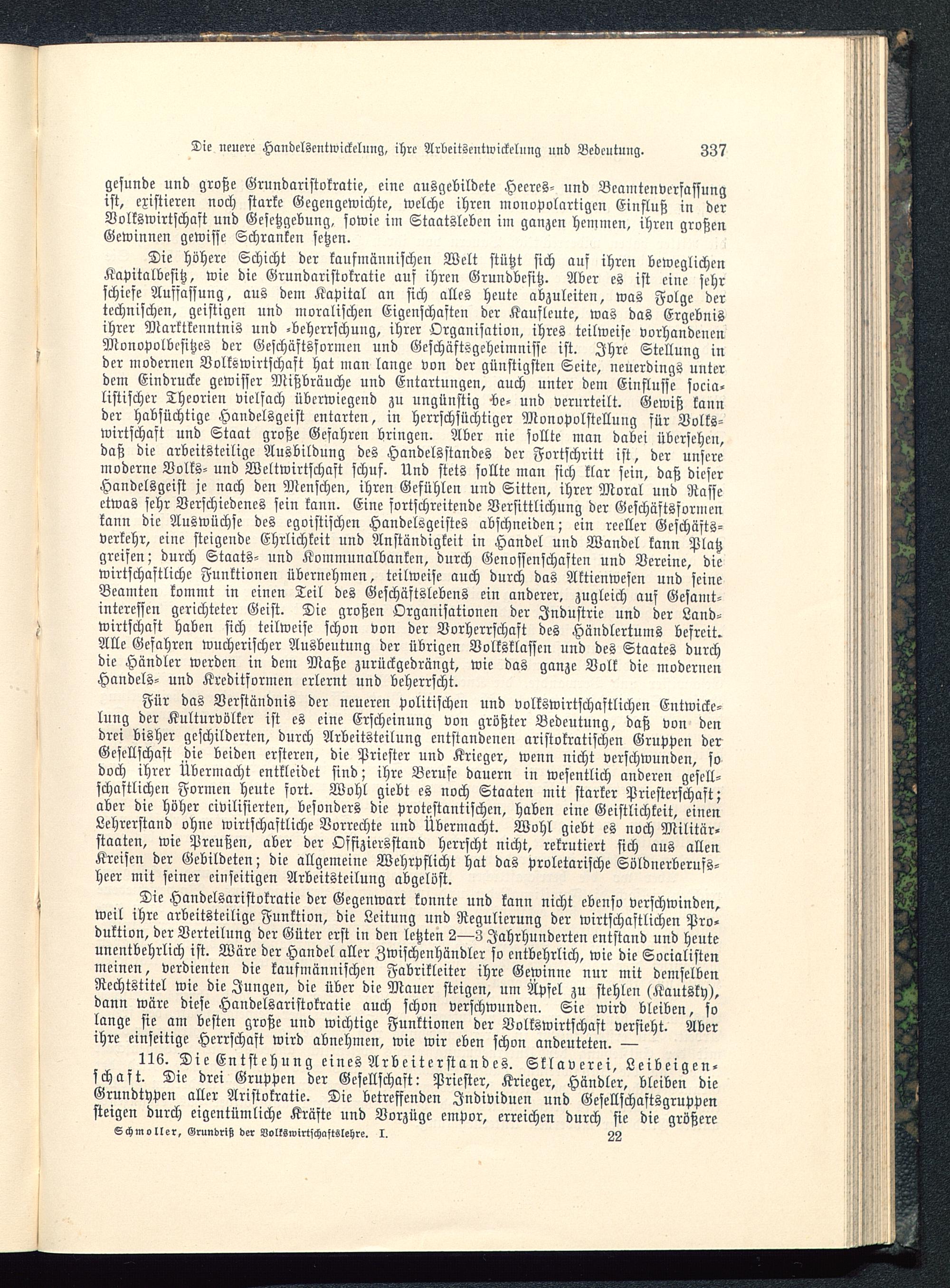 Die Handelsaristokratie der Gegenwart konnte und kann nicht ebenso verschwinden,weil ihre arbeitsteilige Funktion, die Leitung und Regulierung der wirtschaftlichen Pro-duktion, der Verteilung der Güter erst in den letzten 2—3 Jahrhunderten entstand und heuteunentbehrlich ist. Wäre der Handel aller Zwischenhändler so entbehrlich, wie die Socialistenmeinen, verdienten die kaufmännischen Fabrikleiter ihre Gewinne nur mit demselbenRechtstitel wie die Jungen, die über die Mauer steigen, um Äpfel zu stehlen (Kautsky ),dann wäre diese Handelsaristokratie auch schon verschwunden. Sie wird bleiben, solange sie am besten große und wichtige Funktionen der Volkswirtschaft versieht. Aberihre einseitige Herrschaft wird abnehmen, wie wir eben schon andeuteten. —