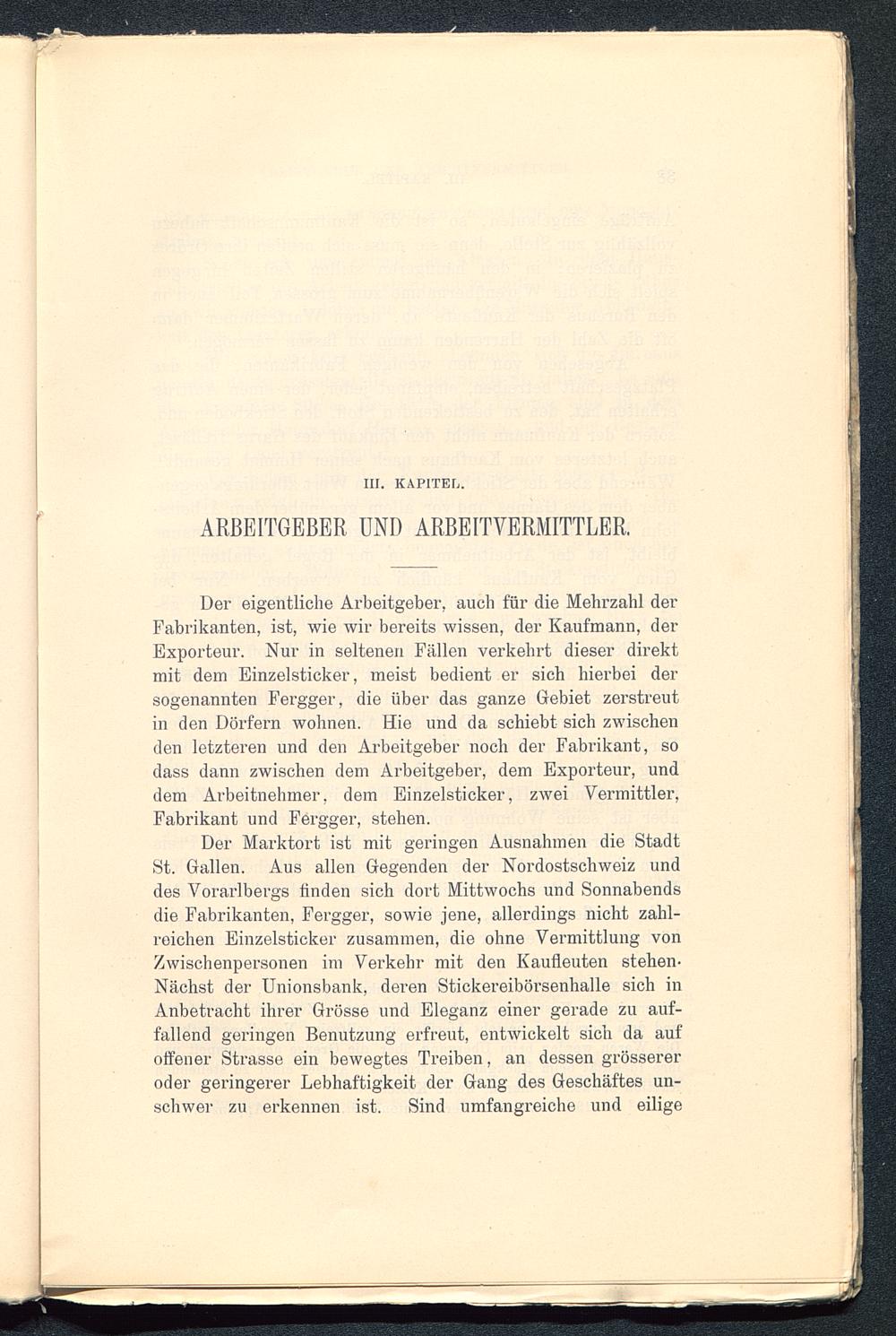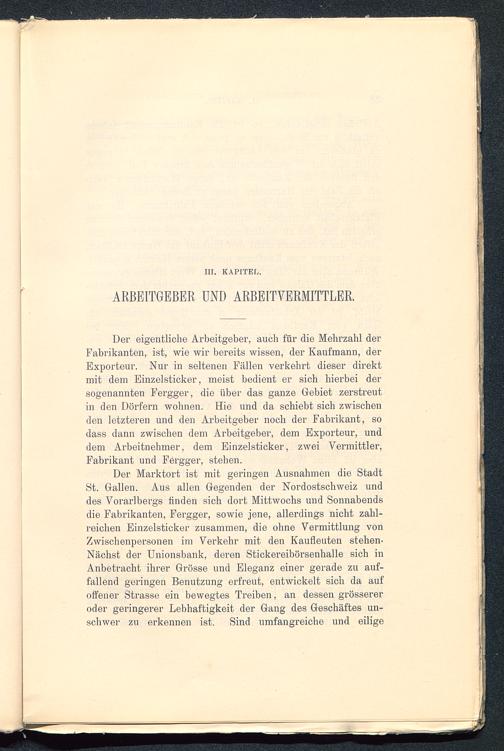 Der eigentliche Arbeitgeber, auch für die Mehrzahl derFabrikanten, ist, wie wir bereits wissen, der Kaufmann, derExporteur. Nur in seltenen Fällen verkehrt dieser direktmit dem Einzelsticker, meist bedient er sich hierbei dersogenannten Fergger, die über das ganze Gebiet zerstreutin den Dörfern wohnen. Hie und da schiebt sich zwischenden letzteren und den Arbeitgeber noch der Fabrikant, sodass dann zwischen dem Arbeitgeber, dem Exporteur, unddem Arbeitnehmer, dem Einzelsticker, zwei Vermittler,Fabrikant und Fergger, stehen.