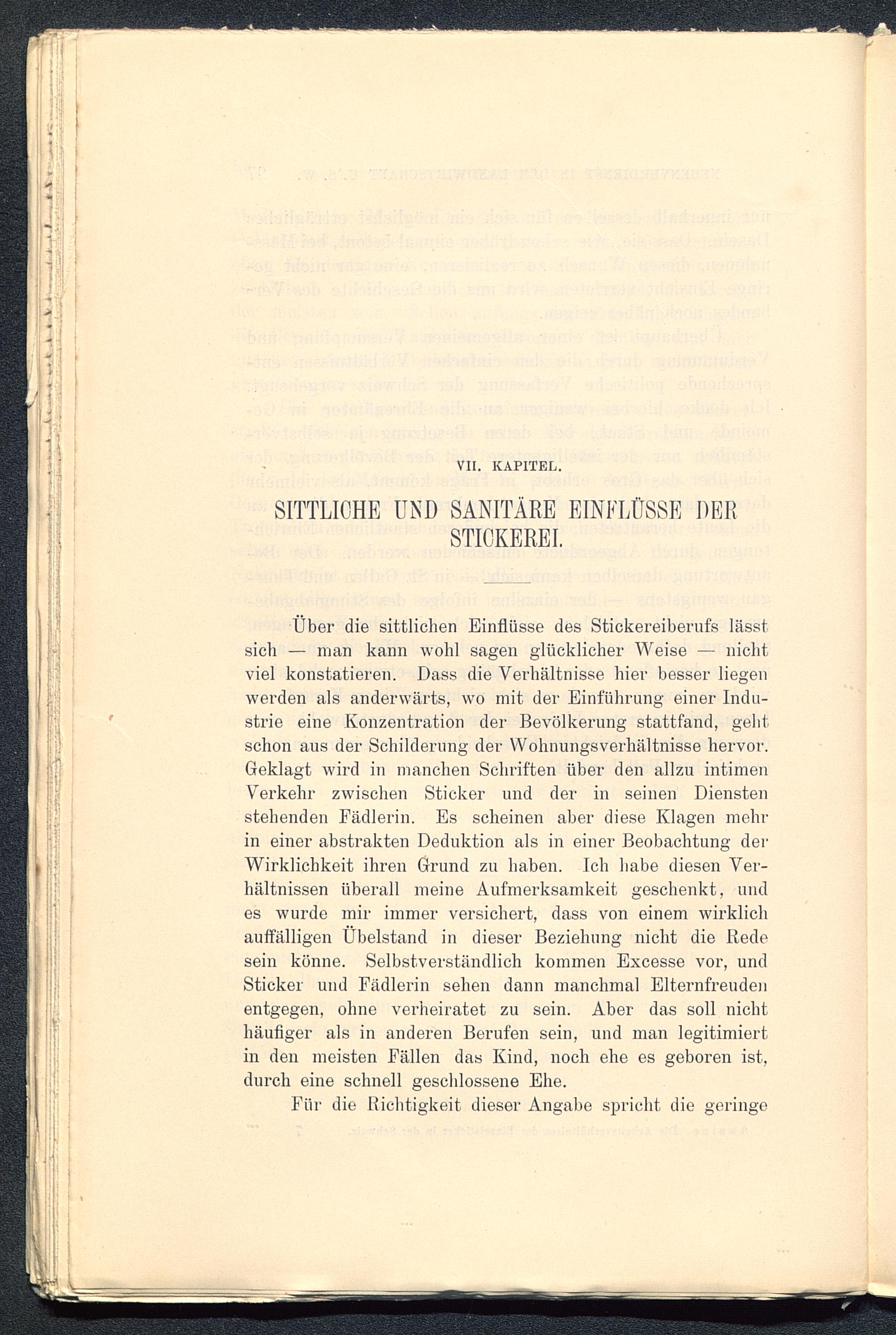 Über die sittlichen Einflüsse des Stickereiberufs lässtsich — man kann wohl sagen glücklicher Weise — nichtviel konstatieren. Dass die Verhältnisse hier besser liegenwerden als anderwärts, wo mit der Einführung einer Indu-strie eine Konzentration der Bevölkerung stattfand, gehtschon aus der Schilderung der Wohnungsverhältnisse hervor.Geklagt wird in manchen Schriften über den allzu intimenVerkehr zwischen Sticker und der in seinen Dienstenstehenden Fädlerin. Es scheinen aber diese Klagen mehrin einer abstrakten Deduktion als in einer Beobachtung derWirklichkeit ihren Grund zu haben. Ich habe diesen Ver-hältnissen überall meine Aufmerksamkeit geschenkt, undes wurde mir immer versichert, dass von einem wirklichauffälligen Übelstand in dieser Beziehung nicht die Redesein könne. Selbstverständlich kommen Excesse vor, undSticker und Fädlerin sehen dann manchmal Elternfreudenentgegen, ohne verheiratet zu sein. Aber das soll nichthäufiger als in anderen Berufen sein, und man legitimiertin den meisten Fällen das Kind, noch ehe es geboren ist,durch eine schnell geschlossene Ehe.