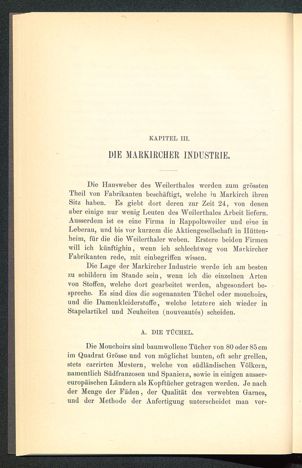 Die Hausweber des Weilerthaies werden zum grösstenTheil von Fabrikanten beschäftigt, welche in Markirch ihrenSitz haben. Es giebt dort deren zur Zeit 24, von denenaber einige nur wenig Leuten des Weilerthaies Arbeit liefern.Ausserdem ist es eine Firma in Rappoltsweiler und eine inLeberau, und bis vor kurzem die Aktiengesellschaft in liütton-heim, für die die Weilerthaler weben. Erstere beiden Firmenwill ich künftighin, wenn ich schlechtweg von MarkircherFabrikanten rede, mit einbegriffen wissen.