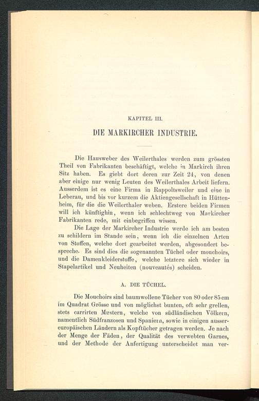 Die Lage der Markircher Industrie werde ich am bestenzu schildern im Stande sein, wenn ich die einzelnen Artenvon Stoffen, welche dort gearbeitet werden, abgesondert be-spreche. Es sind dies die sogenannten Tiichel oder mouchoirs,und die Damenkleiderstoffe, welche letztere sich wieder inStapelartikel und Neuheiten (nouveautes) scheiden.