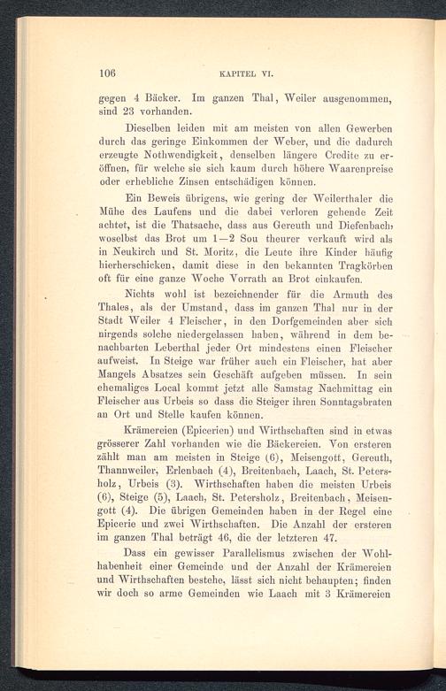 Krämereien (Epicerien) und Wirtschaften sind in etwasgrösserer Zahl vorhanden wie die Bäckereien. Von ersterenzählt man am meisten in Steige (6), Meisengott, Gereuth,Thannweiler, Erlenbach (4), Breitenbach, Laach, St. Peters-holz , Urbeis (3). Wirtschaften haben die meisten Urbeis(6), Steige (5), Laach, St. Petersholz, Breitenbach, Meisen-gott (4). Die übrigen Gemeinden haben in der Kegel eineEpicerio und zwei Wirtschaften. Die Anzahl der ersterenim ganzen Thal beträgt 46, die der letzteren 47.