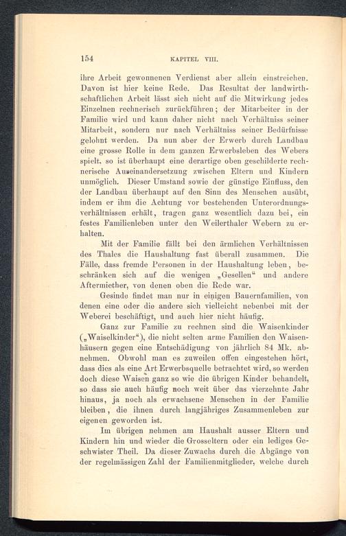 Ganz zur Familie zu rechnen sind die Waisenkinder(„Waiselkinder“), die nicht selten arme Familien den Waisen-häusern gegen eine Entschädigung von jährlich 84 Mk. ab-nehmen. Obwohl man es zuweilen offen eingestehen hört,dass dies als eine Art Erwerbsquelle betrachtet wird, so werdendoch diese Waisen ganz so wie die übrigen Kinder behandelt,so dass sie auch häufig noch weit über das vierzehnte Jahrhinaus, ja noch als erwachsene Menschen in der Familiebleiben, die ihnen durch langjähriges Zusammenleben zureigenen geworden ist.