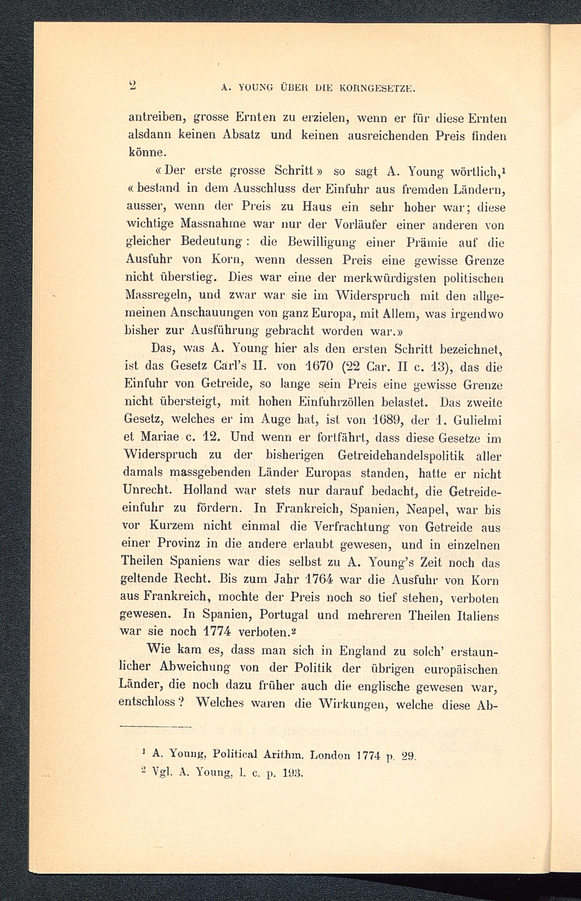 Das, was A. Young hier als den ersten Schritt bezeichnet,ist das Gesetz Carl’s II. von 1670 (22 Car. II c. 13), das dieEinfuhr von Getreide, so lange sein Preis eine gewisse Grenzenicht übersteigt, mit hohen Einfuhrzöllen belastet. Das zweiteGesetz, welches er im Auge hat, ist von 1089, der 1. Gulielmiet Mariae c. 12. Und wenn er fortfährt, dass diese Gesetze imWiderspruch zu der bisherigen Getreidehandelspolitik allerdamals massgebenden Länder Europas standen, hatte er nichtUnrecht. Holland war stets nur darauf bedacht, die Getreide-einfuhr zu fördern. In Frankreich, Spanien, Neapel , war bisvor Kurzem nicht einmal die Verfrachtung von Getreide auseiner Provinz in die andere erlaubt gewesen, und in einzelnenTheilen Spaniens war dies selbst zu A. Young’s Zeit noch dasgeltende Recht. Bis zum Jahr 1764 war die Ausfuhr von Kornaus Frankreich , mochte der Preis noch so tief stehen, verbotengewesen. In Spanien, Portugal und mehreren Theilen Italiens war sie noch 1774 verboten. 1 2